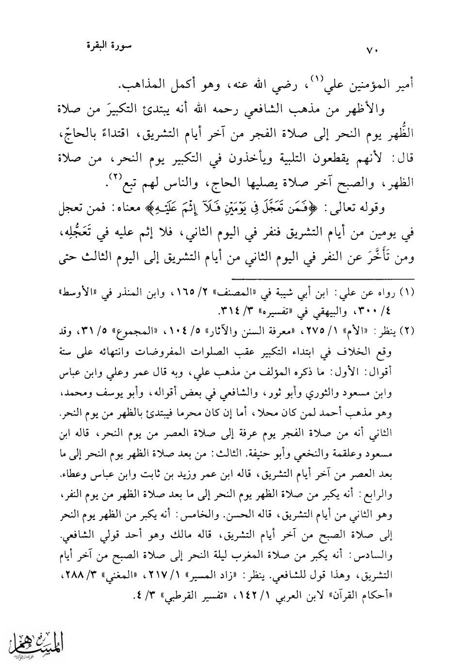 قيل: معناه: فمن تعجل في يومين فلا إثم عليه، ومن تأخر فهو مبرور مأجور. فقال: (فلا إثم عليه) وهو يريد هذا المعنى لتوافق اللفظةُ الأولى الثانيةَ، وتكون على مثلِ سبيلها، وقد ذكرنا أنه حُمِلَ على موافقة اللفظ بما لا يصلح في المعنى (¬2) وهو قوله: {وَجَزَاءُ سَيِّئَةٍ سَيِّئَةٌ} [الشورى: 40]، وقوله: {فَمَنِ اعْتَدَى عَلَيْكُمْ فَاعْتَدُوا عَلَيْهِ} [البقرة: 194]، فَلأَن يحمل على موافقة اللفظ بما يَصِحُّ في المعنى أولى؛ لأن المبرور المأجور يصح في المعنى نفيُ الإثم عنه.
