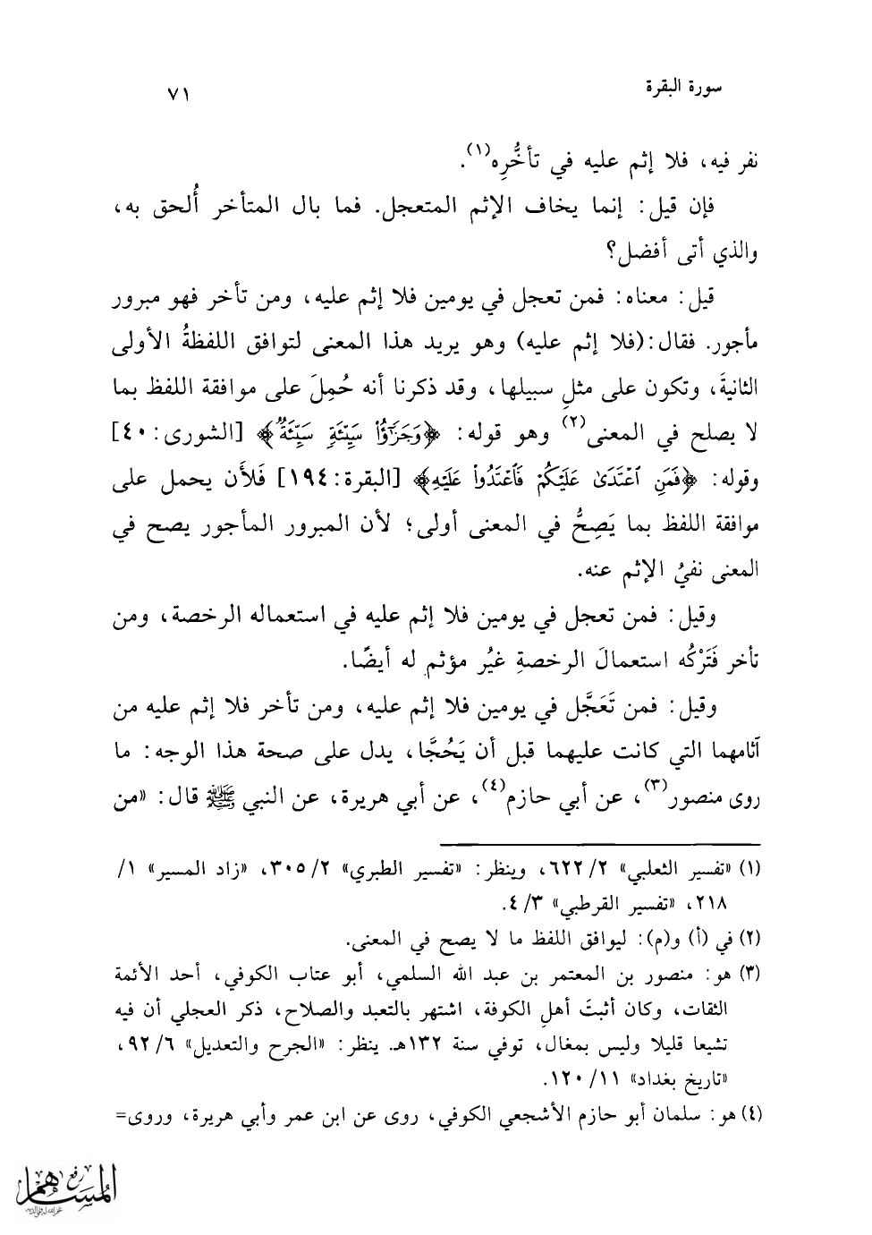 وذهب بعض المتأولين: إلى أن المراد بوضع الإثم عنه المتعجلُ دون المتأخر، ولكن ذُكرا معًا والمراد أحدُهما، كقوله: {فَلَا جُنَاحَ عَلَيْهِمَا فِيمَا افْتَدَتْ بِهِ} [البقرة: 229] والجناح على الزوج؛ لأنه أخذ ما أعطى، وقد قال الله تعالى: {وَلَا يَحِلُّ لَكُمْ أَنْ تَأْخُذُوا مِمَّا آتَيْتُمُوهُنَّ شَيْئًا} [البقرة: 229] ومثل هذا قوله: {نَسِيَا حُوتَهُمَا} [الكهف: 61]، نسب النسيان إليهما، والناسي أحدُهما، وقوله {يَخْرُجُ مِنْهُمَا اللُّؤْلُؤُ وَالْمَرْجَانُ} [الرحمن: 22]، وإنما يخرج من أحدهما (¬2).