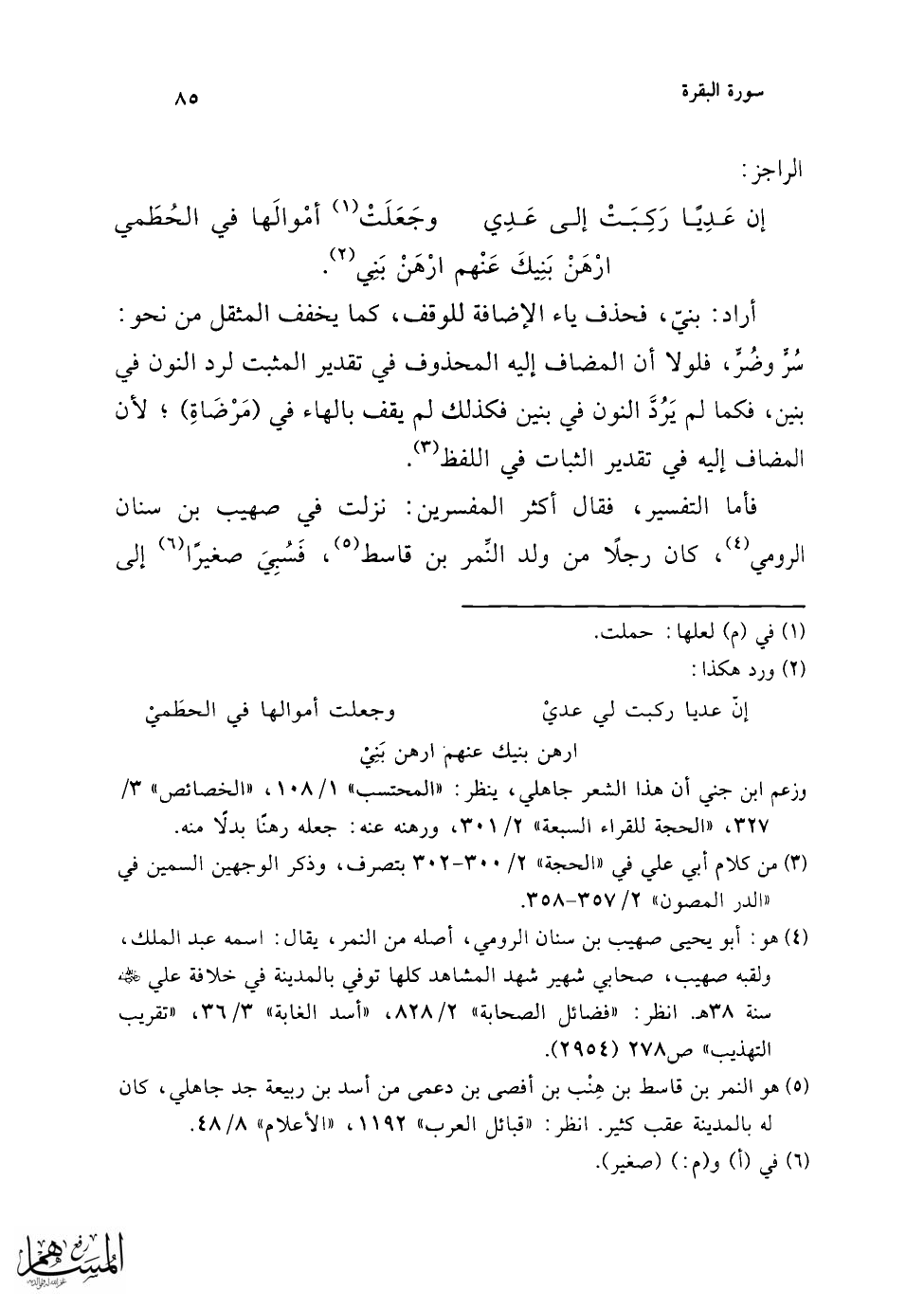 الروم، فتغير لسانه، ثم كان مملوكًا لابن جُدْعان (¬1)، فآمن بالله وصدق النبي - صلى الله عليه وسلم -، وأقبل مهاجرًا إليه، فأخذه المشركون، فقال لهم صهيب: إني شيخ كبير لا يضركم أَمِنْكُم كنت أم من غيركم، فهل لكم أن تأخذوا مالي وتذروني وديني؟ ففعلوا ذلك، وكان قد شرط عليهم راحلة ونفقة، فلما بلغ المدينة تلقاه أبو بكر وعمر رضي الله عنهما في رجال، فقال له أبوبكر: ربحَ بيعُك أبا يحيى، فقال له (¬2) صهيب: وبيعك فلا يخسر، ما ذاك؟ فقال أنزل الله (¬3) فيك، وقرأ عليه هذه الآية (¬4).