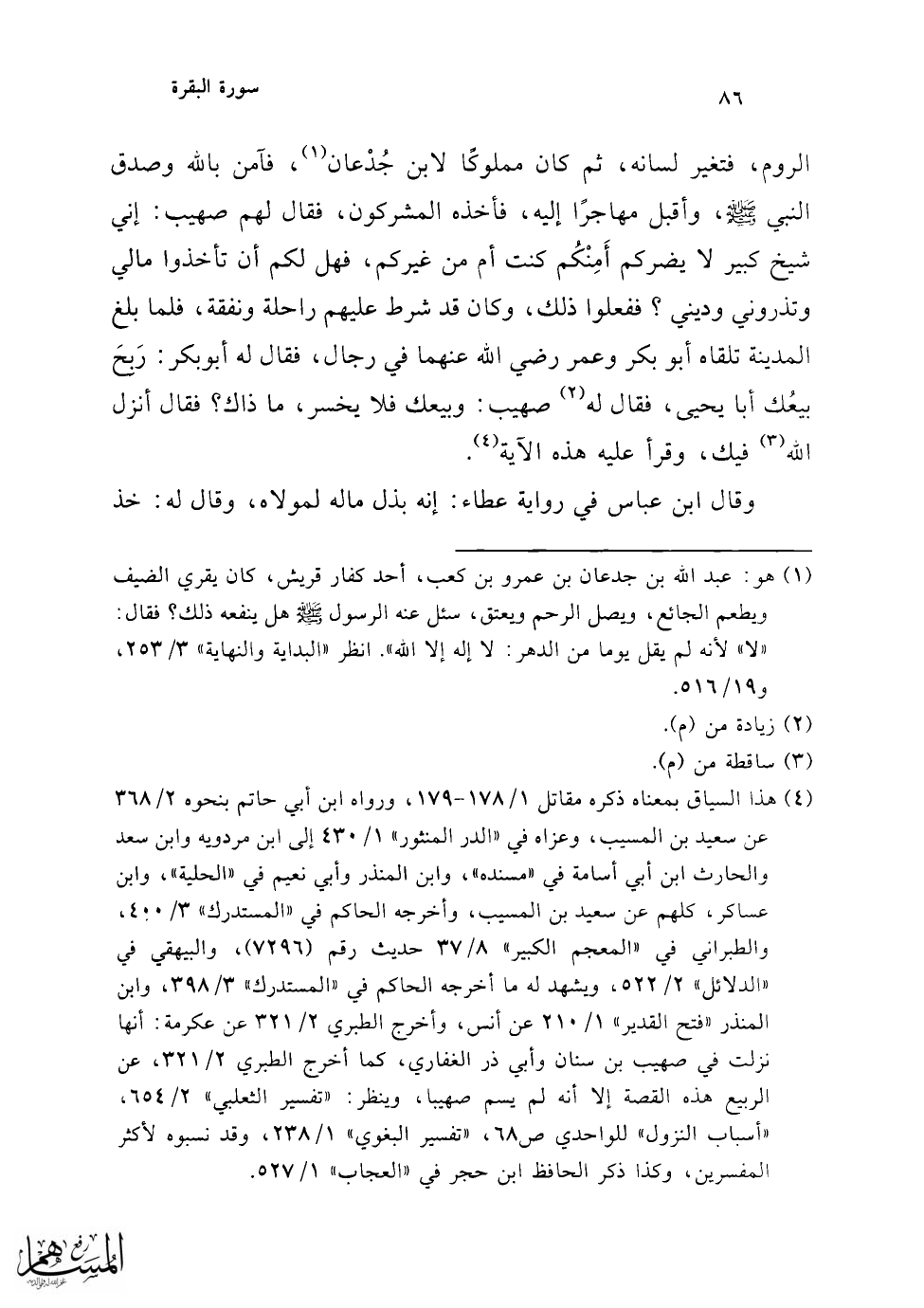 (¬3) رواه عنه الطبري في "تفسيره" 2/ 320، ومراد ابن عباس: أن قوله: وإذا قيل له اتق الله أخذته العزة بالإثم، هي في الكافر يأمره المؤمن بتقوى الله، فيرد ذلك الكافر فيقول المؤمن: وأنا أشري نفسي ابتغاء مرضاة الله، فيقتتل الرجلان، وبمعنى هذا: ما روي عن عمر أنها نزلت في الأمر بالمعروف والنهي عن المنكر، كما ذكره الواحدي في "أسباب النزول" ص 68، ونقله ابن حجر في "العجاب" 1/ 528، وقال: أسنده عبد بن حميد، وبمعناه أيضا ما روي عن الحسن، وذكره الواحدي في "أسباب النزول" ص 68، والثعلبي في "تفسيره" 2/ 658.