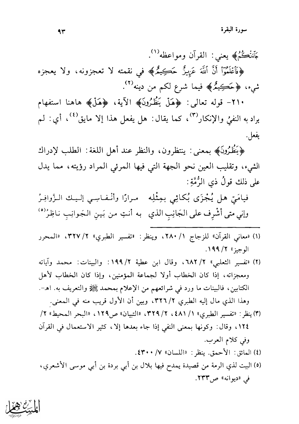 (¬3) ينظر في (نظر) "تهذيب اللغة" 4/ 3603 - 3606، "المفردات" ص 499 - 500، "اللسان" 7/ 4465 - 4468 (نظر)، "البحر المحيط" 2/ 124.