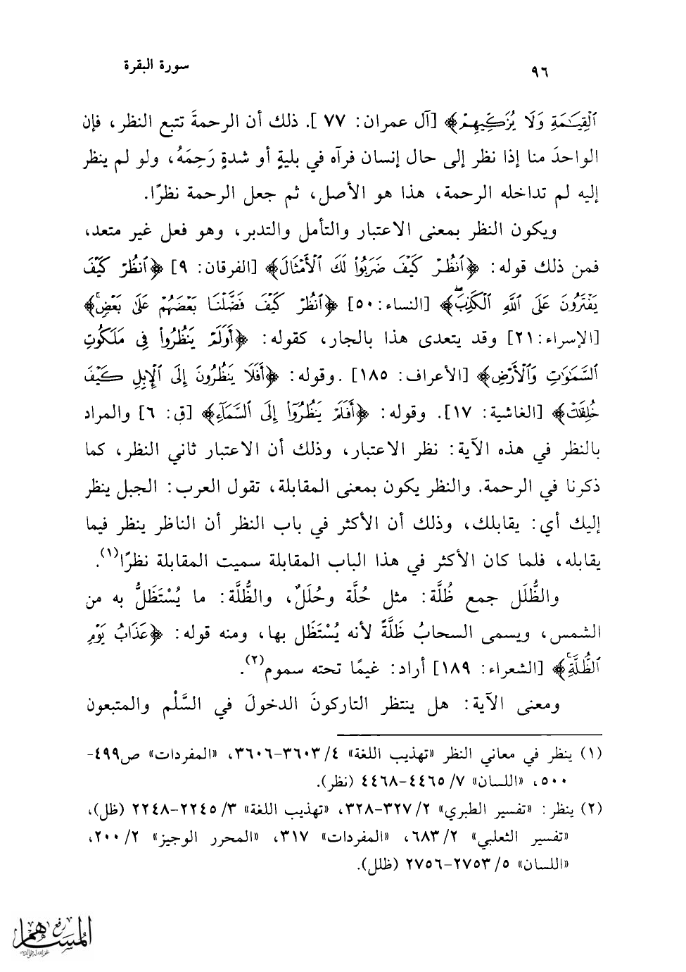 وفي قوله تعالى {إِلَّا أَنْ يَأْتِيَهُمُ اللَّهُ فِي ظُلَلٍ مِنَ الْغَمَامِ} وجهان: أحدهما: أن هذا من بابِ المضاف، أذ يأتيهم عذابُ الله، أو أمرُ الله، أو آياتُ الله، فجعل مجيء الآيات والعذاب مجيئًا له، تفخيمًا لأن العذاب وتعظيمًا له.