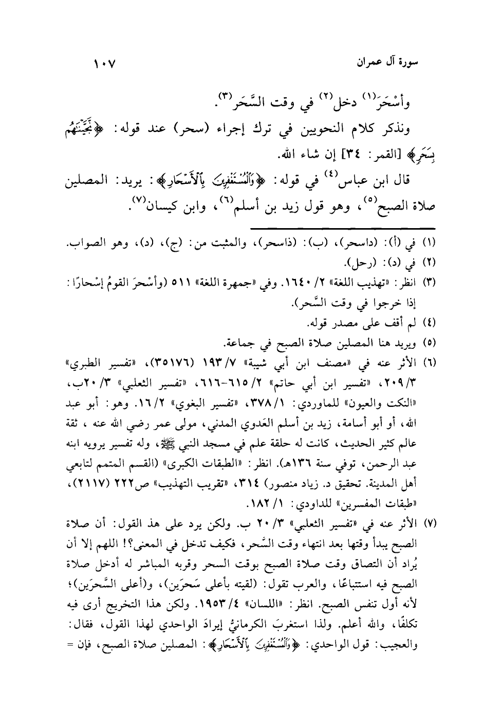 (¬7) الأثر عنه في "تفسير الثعلبي" 3/ 20 ب. ولكن يرد على هذ القول: أن صلاة الصبح يبدأ وقتها بعد انتهاء وقت السَّحر، فكيف تدخل في المعنى؟! اللهم إلا أن يُراد أن التصاق وقت صلاة الصبح بوقت السحر وقربه المباشر له أدخل صلاة الصبح فيه استتباعًا، والعرب تقول: (لقيته بأعلى سَحرَين)، و (أعلى السَّحرَين)، لأنه أول تنفس الصبح. انظر: "اللسان" 4/ 1953. ولكن هذا التخريج أرى فيه تكلفًا، والله أعلم. ولذا استغربَ الكرمانيُّ إيرادَ الواحدي لهذا القول، فقال: والعجيب: قول الواحدي: {وَالْمُسْتَغْفِرِينَ بِالْأَسْحَارِ}: المصلين صلاة الصبح، فإن =