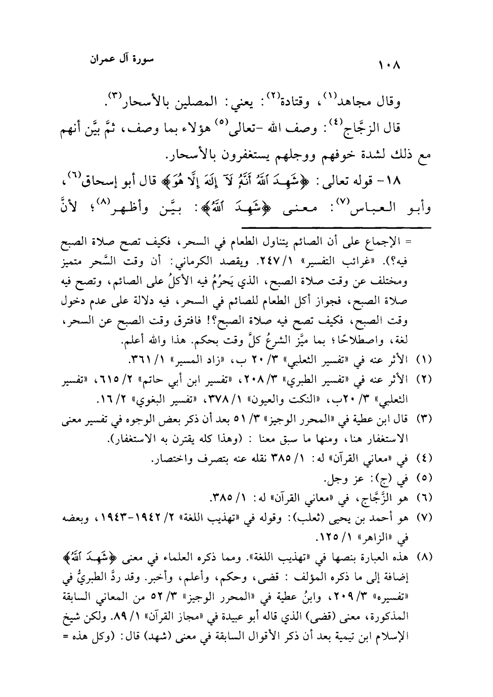 (¬8) هذه العبارة بنصها في "تهذيب اللغة". ومما ذكره العلماء في معنى {شَهِدَ اللَّهُ} إضافة إلى ما ذكره المؤلف: قضى، وحكم، وأعلم، وأخبر. وقد ردَّ الطبريُّ في "تفسيره" 3/ 209، وابنُ عطية في "المحرر الوجيز" 3/ 52 من المعاني السابقة المذكورة، معنى (قضى) الذي قاله أبو عبيدة في "مجاز القرآن" 1/ 89 ولكن شيخ الإسلام ابن تيمية بعد أن ذكر الأقوال السابقة في معنى (شهد) قال: (وكل هذه =