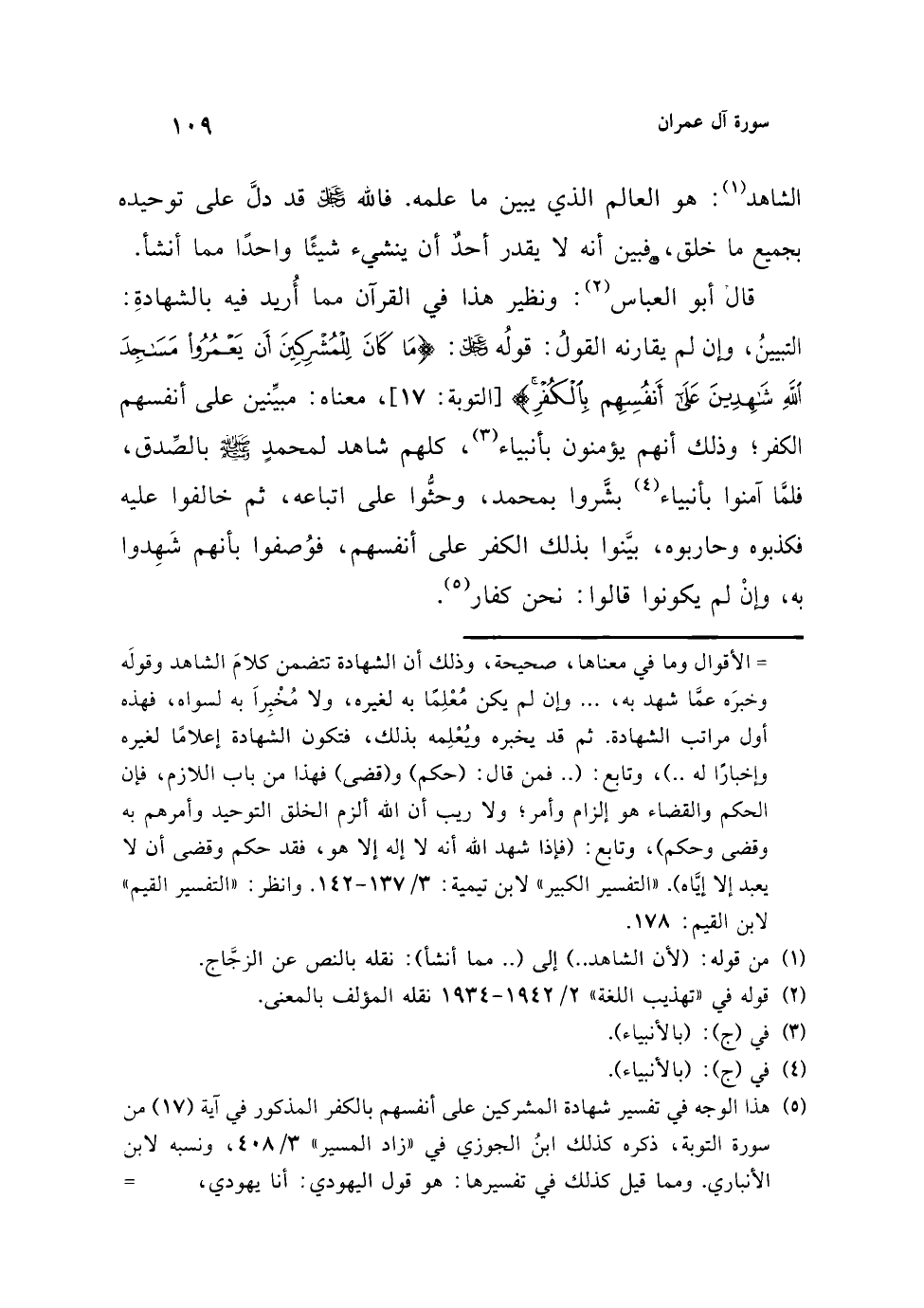 قال أبو العباس (¬2): ونظير هذا في القرآن مما أُريد فيه بالشهادةِ: التبيينُ، وإن لم يقارنه القولُ: قولُه عز وجل: {مَا كَانَ لِلْمُشْرِكِينَ أَنْ يَعْمُرُوا مَسَاجِدَ اللَّهِ شَاهِدِينَ عَلَى أَنْفُسِهِمْ بِالْكُفْرِ} [التوبة: 17]، معناه: مبيِّنين على أنفسهم الكفر؛ وذلك أنهم يؤمنون بأنبياء (¬3)، كلهم شاهد لمحمدٍ - صلى الله عليه وسلم - بالصِّدق، فلما آمنوا بأنبياء (¬4) بشَّروا بمحمد، وحثُّوا على اتباعه، ثم خالفوا عليه فكذبوه وحاربوه، بيَّنوا بذلك الكفر على أنفسهم، فوُصفوا بأنهم شَهِدوا به، وإنْ لم يكونوا قالوا: نحن كفار (¬5).