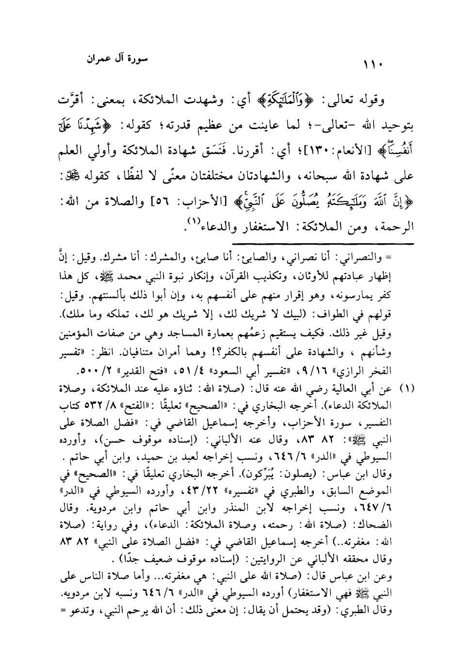 (¬1) عن أبي العالية رضي الله عنه قال: (صلاة الله: ثناؤه عليه عند الملائكة، وصلاة الملائكة الدعاء). أخرجه البخاري في: "الصحيح" تعليقًا: "الفتح" 8/ 532 كتاب التفسير، سورة الأحزاب، وأخرجه إسماعيل القاضي في: "فضل الصلاة على النبي - صلى الله عليه وسلم -": 82، 83، وقال عنه الألباني: (إسناده موقوف حسن)، وأورده السيوطي في "الدر" 6/ 646، ونسب إخراجه لعبد بن حميد، وابن أبي حاتم. وقال ابن عباس: (يصلون: يُبَرِّكون). أخرجه البخاري تعليقًا في: "الصحيح" في الموضع السابق، والطبري في "تفسيره" 22/ 43، وأورده السيوطي في " الدر" 6/ 647، ونسب إخراجه لابن المنذر وابن أبي حاتم وابن مردوية. وقال الضحاك: (صلاة الله: رحمته، وصلاة الملائكة: الدعاء)، وفي رواية: (صلاة الله: مغفرته ..) أخرجه إسماعيل القاضي في: "فضل الصلاة على النبي" 82، 83 وقال محققه الألباني عن الروايتين: (إسناده موقوف ضعيف جدًا).