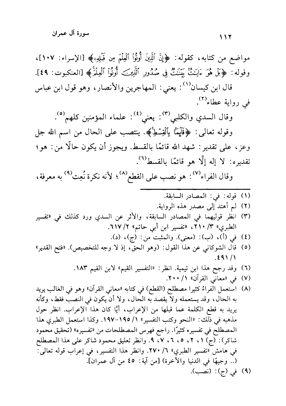 وقوله تعالى: {قَائِمًا بِالْقِسْطِ}. ينتصب على الحال من اسم الله جل وعز، على تقدير: شهد الله قائمًا بالقسط. ويجوز أن يكون حالًا من: هو؛ تقديره: لا إله إلَّا هو قائمًا بالقسط (¬6).