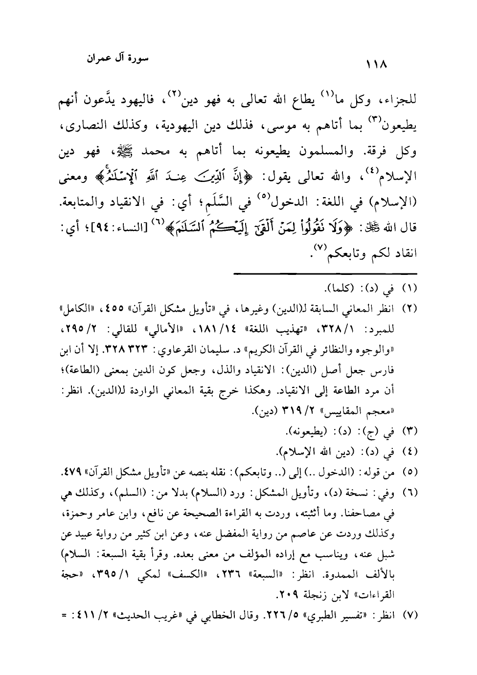 (السَّلَمُ: الاستسلام) وقال بعد أن أورد آية 94 من النساء بقرأءة (السَّلَم): (أي: من استسلم وأعطى المقادة، وكذلك (الإسلام)؛ إنما هو: الطاعة لله، والانقياد لأمره، وأحدهما مشتق من الآخر). وانظر: "النهاية في غريب الحديث" 2/ 394، "اللسان" 4/ 2077 (سلم).