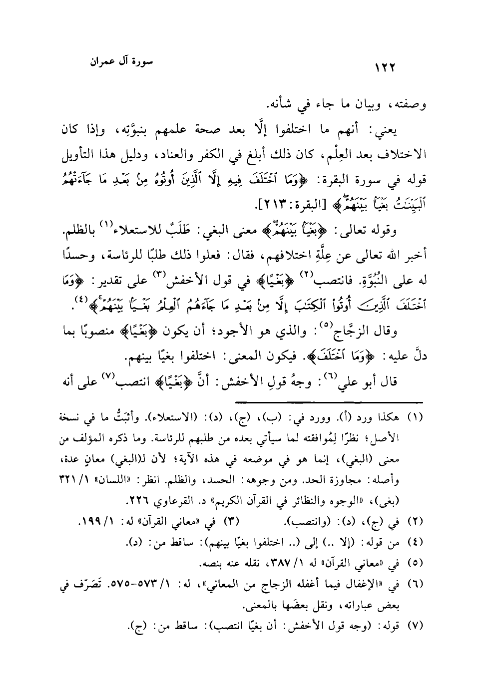 وقال الزجَّاج (¬5): والذي هو الأجود؛ أن يكون {بَغْيًا} منصوبًا بما دلَّ عليه: {وَمَا اخْتَلَفَ}. فيكون المعنى: اختلفوا بغيًا بينهم.