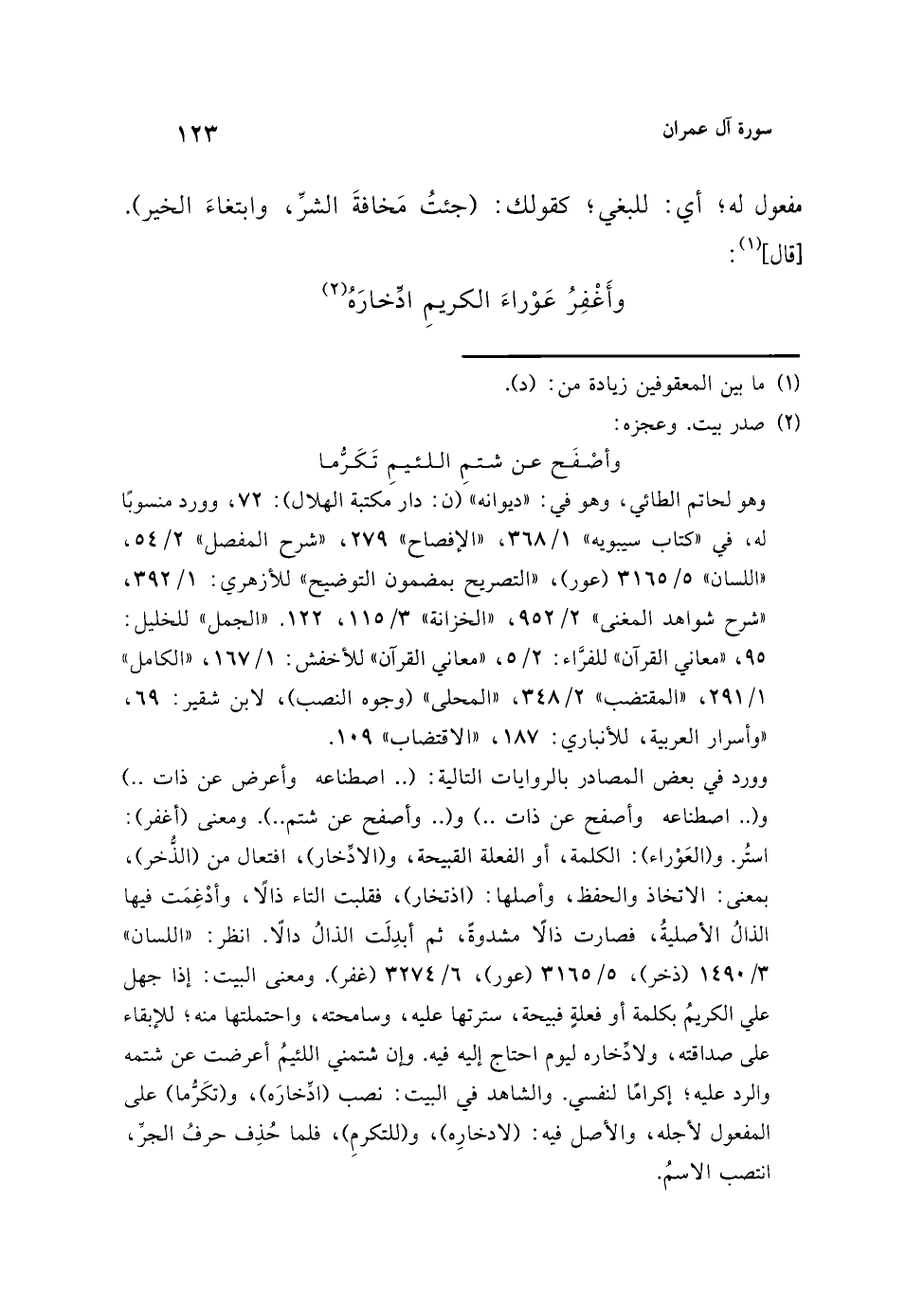 وورد في بعض المصادر بالروايات التالية: (.. اصطناعه وأعرض عن ذات ..) و (.. اصطناعه وأصفح عن ذات ..) و (.. وأصفح عن شتم ..). ومعنى (أغفر): استُر. و (العَوْراء): الكلمة، أو الفعلة القبيحة، و (الادِّخار)، افتعال من (الذُّخر)، بمعنى: الاتخاذ والحفظ، وأصلها: (اذتخار)، فقلبت التاء ذالًا، وأدْغِمَت فيها الذالُ الأصليةُ، فصارت ذالًا مشدوةً، ثم أبدِلَت الذالُ دالًا. انظر: "اللسان" 3/ 1490 (ذخر)، 5/ 3165 (عور)، 6/ 3274 (غفر). ومعنى البيت: إذا جهل علي الكريمُ بكلمة أو فعلةٍ قبيحة، سترتها عليه، وسامحته، واحتملتها منه؛ للإبقاء على صداقته، ولادِّخاره ليوم احتاج إليه فيه. وإن شتمني اللئيمُ أعرضت عن شتمه والرد عليه؛ إكرامًا لنفسي. والشاهد في البيت: نصب (ادِّخارَه)، و (تكَرُّما) على المفعول لأجله، والأصل فيه: (لادخارِه)، و (للتكرمِ)، فلما حُذِف حرفُ الجرِّ، انتصب الاسمُ.