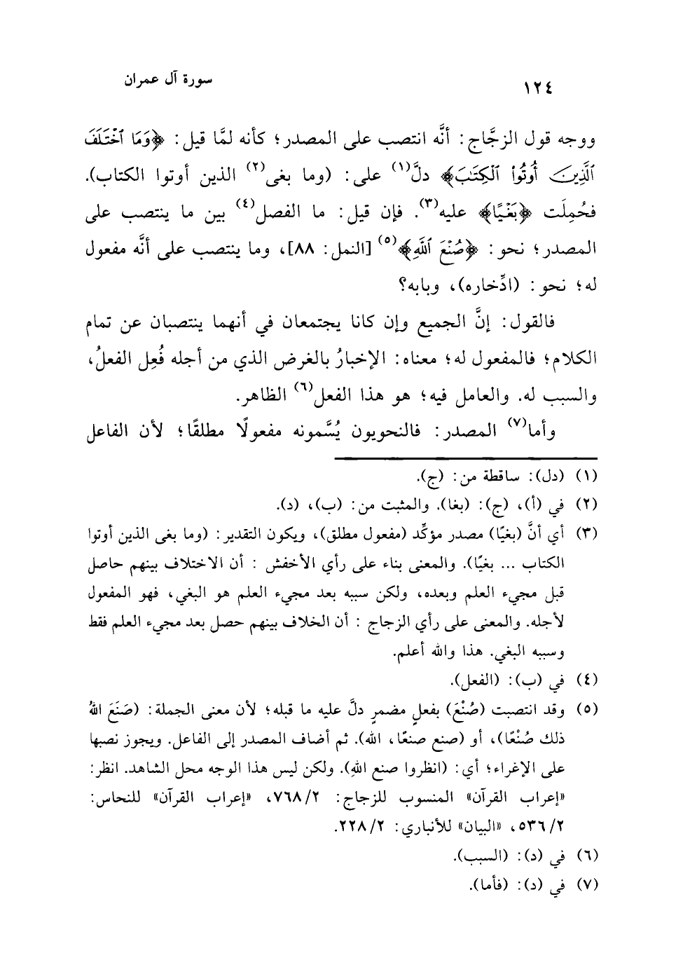 ووجه قول الزجَّاج: أنَّه انتصب على المصدر؛ كأنه لمَّا قيل: {وَمَا اخْتَلَفَ الَّذِينَ أُوتُوا الْكِتَابَ} دلَّ (¬1) على: (وما بغى (¬2) الذين أوتوا الكتاب). فحُمِلَت {بَغْيًا} عليه (¬3). فإن قيل: ما الفصل (¬4) بين ما ينتصب على المصدرة نحو: {صُنْعَ الله} (¬5)، وما ينتصب على أنَّه مفعول له؛ نحو: (ادِّخاره)، وبابه؟