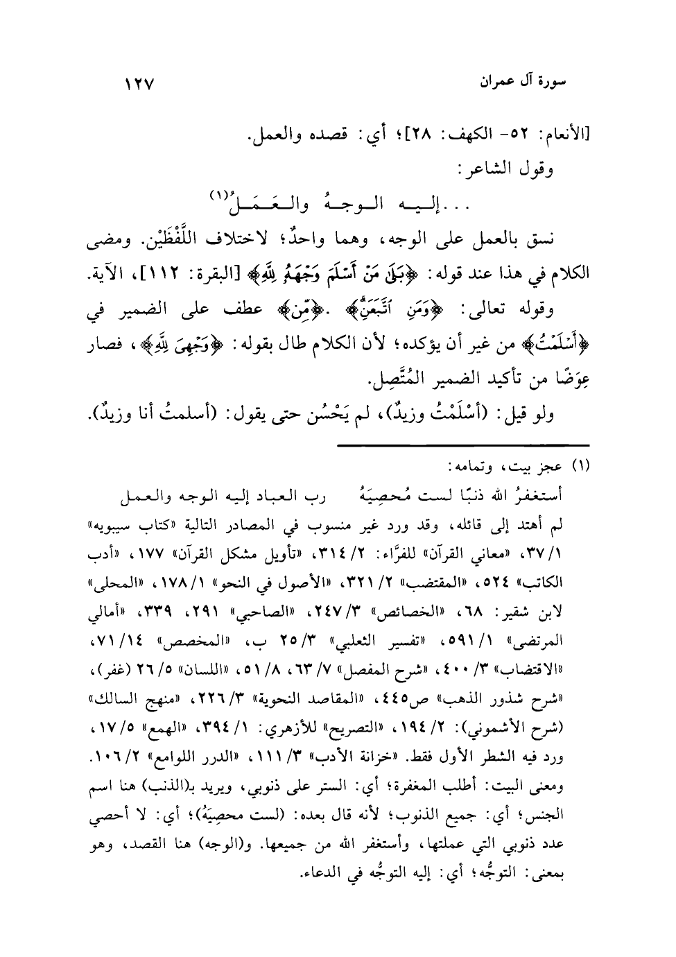 لم أهتد إلى قائله، وقد ورد غير منسوب في المصادر التالية "كتاب سيبويه" 1/ 37، "معاني القرآن" للفرَّاء: 2/ 314، "تأويل مشكل القرآن" 177، "أدب الكاتب" 524، "المقتضب" 2/ 321، "الأصول في النحو" 1/ 178، "المحلى" لابن شقير: 68، "الخصائص" 3/ 247، "الصاحبي" 291، 339، "أمالي المرتضى" 1/ 591، "تفسير الثعلبي" 25/ 3 ب، "المخصص" 14/ 71، "الاقتضاب" 3/ 400، "شرح المفصل" 7/ 63، 8/ 51، "اللسان" 5/ 26 (غفر)، "شرح شذور الذهب" ص 445، "المقاصد النحوية" 3/ 226، "منهج السالك" (شرح الأشموني): 2/ 194، "التصريح" للأزهري: 1/ 394، "الهمع" 5/ 17، ورد فيه الشطر الأول فقط. "خزانة الأدب" 3/ 111، "الدرر اللوامع" 2/ 106. ومعنى البيت: أطلب المغفرة؛ أي: الستر على ذنوبي، ويريد بـ (الذنب) هنا اسم الجنس؛ أي: جميع الذنوب؛ لأنه قال بعده: (لست محصِيَهُ)؛ أي: لا أحصي عدد ذنوبي التي عملتها، وأستغفر الله من جميعها. و (الوجه) هنا القصد، وهو بمعنى: التوجُّه؛ أي: إليه التوجه في الدعاء.