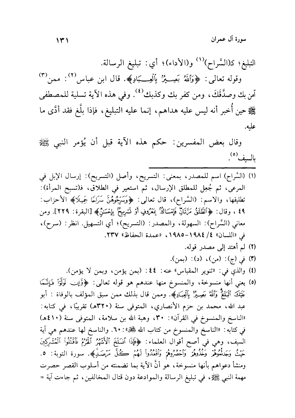 (¬5) يعني أنها منسوخة، والمنسوخ منها عندهم هو قوله تعالى: {وَإِنْ تَوَلَّوْا فَإِنَّمَا عَلَيْكَ الْبَلَاغُ وَاللَّهُ بَصِيرٌ بِالْعِبَادِ}. وممن قال بذلك ممن سبق المؤلف بالوفاة: أبو عبد الله، محمد بن حزم الأنصاري، المتوفى سنة (320 هـ) تقريبًا، في كتابه: "الناسخ والمنسوخ في القرآن": 30، وهبة الله بن سلامة، المتوفى سنة (410 هـ) في كتابه: "الناسخ والمنسوخ من كتاب الله عز وجل": 60. والناسخ لها عندهم هي آية السيف، وهي في أصح أقوال العلماء: {فَإِذَا انْسَلَخَ الْأَشْهُرُ الْحُرُمُ فَاقْتُلُوا الْمُشْرِكِينَ حَيْثُ وَجَدْتُمُوهُمْ وَخُذُوهُمْ وَاحْصُرُوهُمْ وَاقْعُدُوا لَهُمْ كُلَّ مَرْصَدٍ} [التوبة: 5]. ومنشأ دعواهم بأنها منسوخة، هو أنَّ الآية بما تضمنته من أسلوب القصر حصرت مهمة النبي - صلى الله عليه وسلم -، في تبليغ الرسالة والموادعة دون قتال المخالفين، ثم جاءت آية =