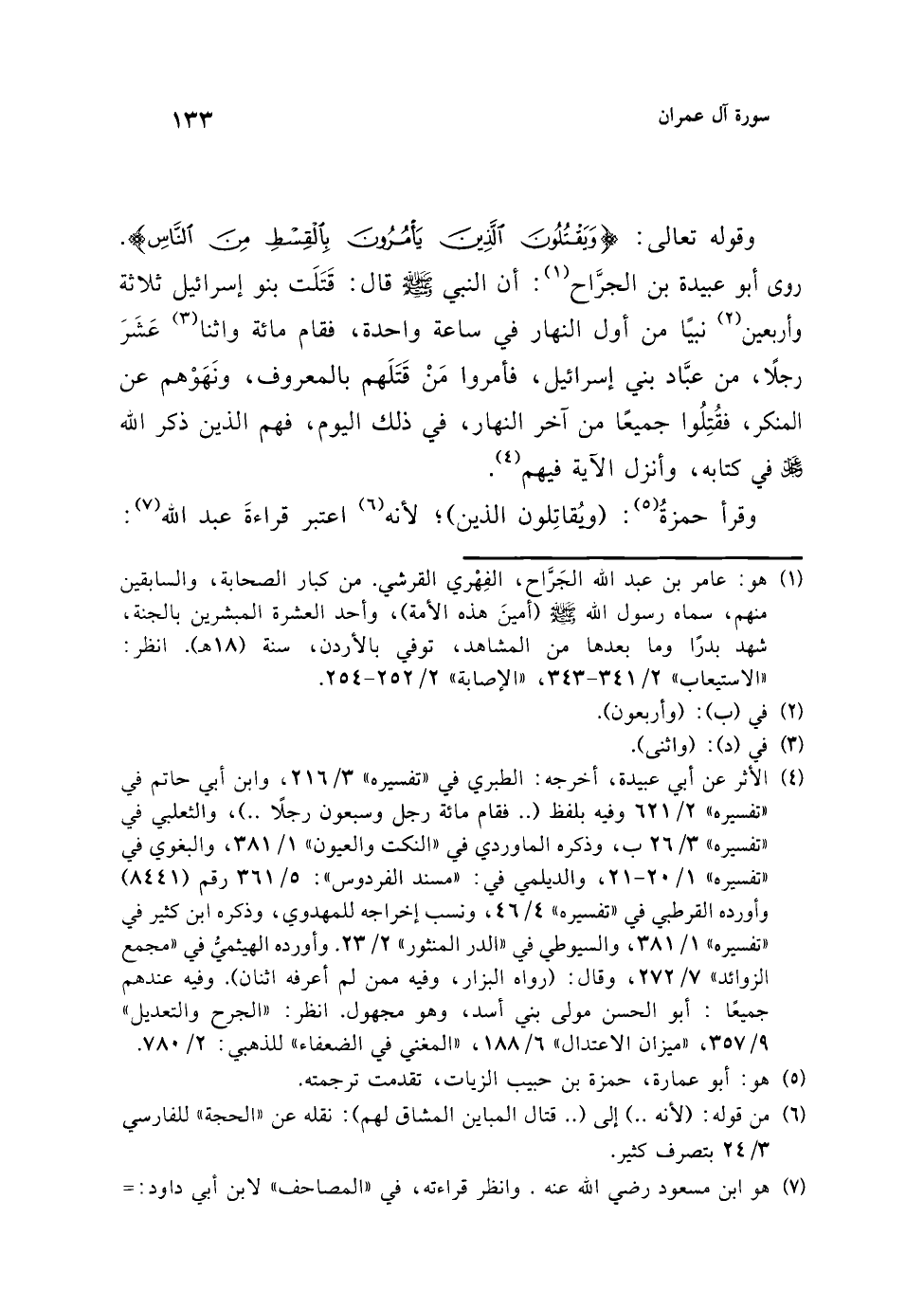 وقوله تعالى: {وَيَقْتُلُونَ الَّذِينَ يَأْمُرُونَ بِالْقِسْطِ مِنَ النَّاسِ}. روى أبو عبيدة بن الجرَّاح (¬1): أن النبي - صلى الله عليه وسلم - قال: قَتَلَت بنو إسرائيل ثلاثة وأربعين (¬2) نبيًا من أول النهار في ساعة واحدة، فقام مائة واثنا (¬3) عَشَرَ رجلًا، من عبَّاد بني إسرائيل، فأمروا مَنْ قَتَلَهم بالمعروف، ونَهَوْهم عن المنكر، فقُتِلُوا جميعًا من آخر النهار، في ذلك اليوم، فهم الذين ذكر الله عز وجل في كتابه، وأنزل الآية فيهم (¬4).