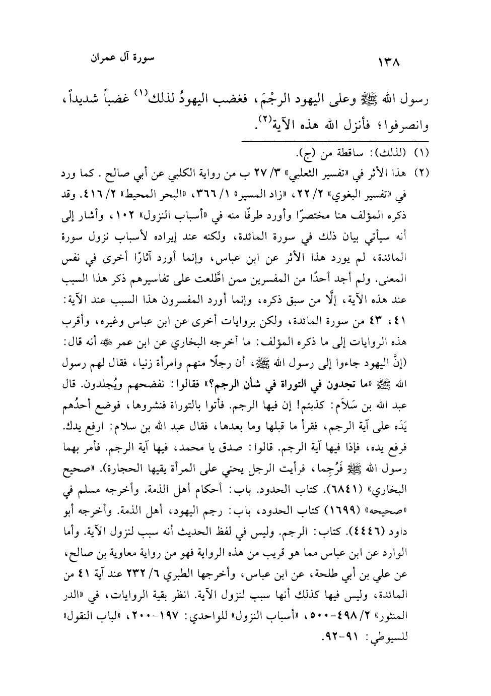 (¬2) هذا الأثر في "تفسير الثعلبي" 3/ 27 ب من رواية الكلبي عن أبي صالح. كما ورد في "تفسير البغوي" 2/ 22، "زاد المسير" 1/ 366، "البحر المحيط" 2/ 416. وقد ذكره المؤلف هنا مختصرًا وأورد طرفًا منه في "أسباب النزول" 102، وأشار إلى أنه سيأتي بيان ذلك في سورة المائدة، ولكنه عند إيراده لأسباب نزول سورة المائدة، لم يورد هذا الأثر عن ابن عباس، وإنما أورد آثارًا أخرى في نفس المعنى. ولم أجد أحدًا من المفسرين ممن اطَّلعت على تفاسيرهم ذكر هذا السبب عند هذه الآية، إلَّا من سبق ذكره، وإنما أورد المفسرون هذا السبب عند الآية: 41، 43 من سورة المائدة، ولكن بروايات أخرى عن ابن عباس وغيره، وأقرب هذه الروايات إلى ما ذكره المؤلف: ما أخرجه البخاري عن ابن عمر - رضي الله عنه - أنه قال: (إنَّ اليهود جاءوا إلى رسول الله - صلى الله عليه وسلم -، أن رجلًا منهم وامرأة زنيا، فقال لهم رسول الله - صلى الله عليه وسلم - "ما تجدون في التوراة في شأن الرجم؟ " فقالوا: نفضحهم ويُجلدون. قال عبد الله بن سَلاَم: كذبتم! إن فيها الرجم. فأتوا بالتوراة فنشروها، فوضع أحدُهم يَدَه على آية الرجم، فقرأ ما قبلها وما بعدها، فقال عبد الله بن سلام: ارفع يدك. فرفع يده، فإذا فيها آية الرجم. قالوا: صدق يا محمد، فيها آية الرجم. فأمر بهما رسول الله - صلى الله عليه وسلم - فَرُجِما، فرأيت الرجل يحني على المرأة يقيها الحجارة). "صحيح البخاري" (6841). كتاب الحدود. باب: أحكام أهل الذمة. وأخرجه مسلم في "صحيحه" (1699) كتاب الحدود، باب: رجم اليهود، أهل الذمة. وأخرجه أبو داود (4446). كتاب: الرجم. وليس في لفظ الحديث أنه سبب لنزول الآية. وأما الوارد عن ابن عباس مما هو قريب من هذه الرواية فهو من رواية معاوية بن صالح، عن علي بن أبي طلحة، عن ابن عباس، وأخرجها الطبري 6/ 232 عند آية 41 من المائدة، وليس فيها كذلك أنها سبب لنزول الآية. انظر بقية الروايات، في "الدر المنثور" 2/ 498 - 500، "أسباب النزول" للواحدي: 197 - 200، "لباب النقول" للسيوطي: 91 - 92.