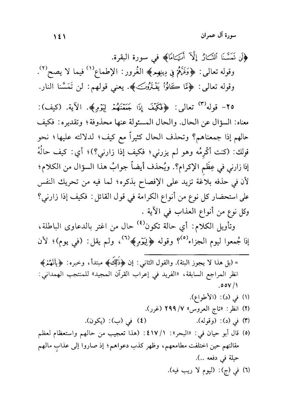 25 - قوله (¬3) تعالى: {فَكَيْفَ إِذَا جَمَعْنَاهُمْ لِيَوْمٍ}. الآية. (كيف): معناه: السؤال عن الحال. والحال المسئولة عنها محذوفة؛ وتقديره: فكيف حالهم إذا جمعناهم؟ وتحذف الحال كثيراً مع كيف؛ لدلالته عليها؛ نحو قولك: (كنت أكْرِمُه وهو لم يزرني؛ فكيف إذا زارني؟)؛ أي: كيف حالُهُ إذا زارني في عِظَمِ الإكرام؟. ويُحذف أيضاً جوابُ هذا السؤال من الكلام؛ لأن في حذفه بلاغة تزيد على الإفصاح بذكره؛ لما فيه من تحريك النفس على استحضار كل نوع من أنواع الكرامة في قول القائل: فكيف إذا زارني؟ وكل نوع من أنواع العذاب في الآية.