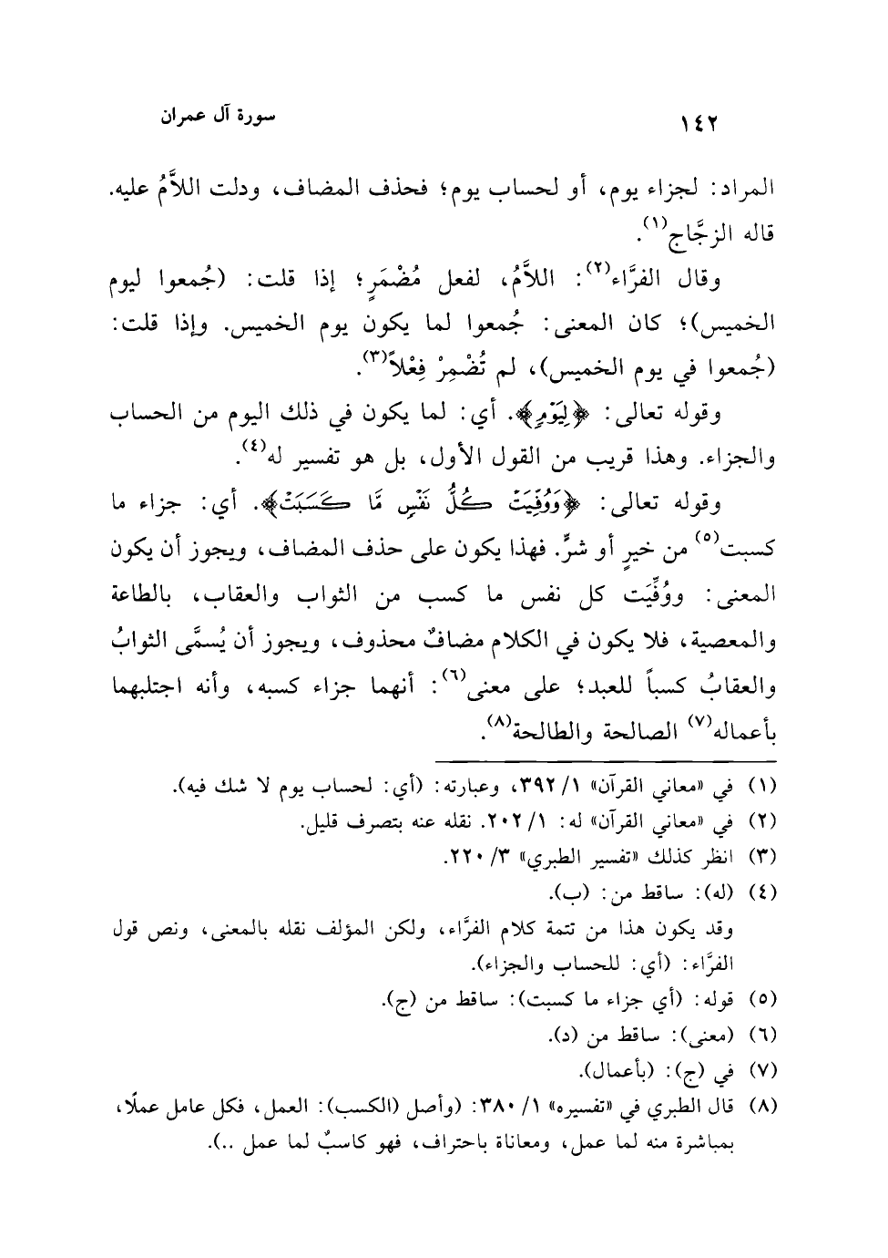 (¬1) في "معاني القرآن" 1/ 392، وعبارته: (أي: لحساب يوم لا شك فيه).