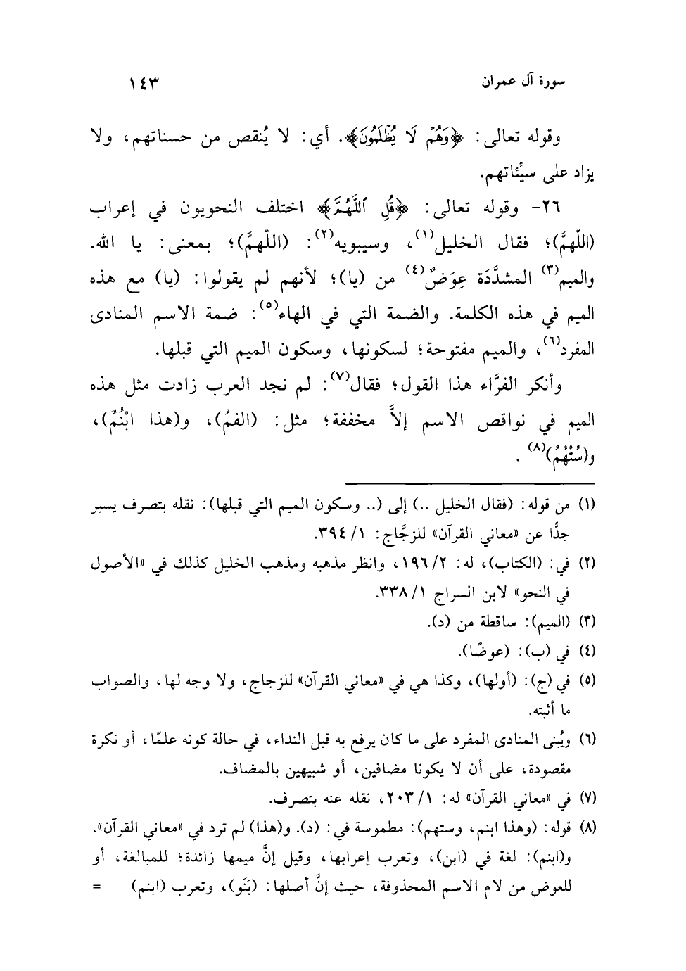(¬1) من قوله: (فقال الخليل ..) إلى (.. وسكون الميم التي قبلها): نقله بتصرف يسير جدًّا عن "معاني القرآن" للزجَّاج: 1/ 394.