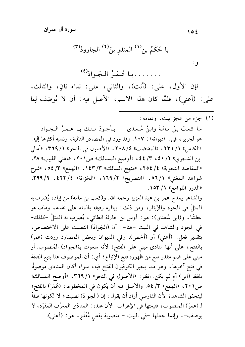 والشاعر يمدح عمر بن عبد العزيز رحمه الله. و (كعب بن مامه) من إياد، يُضرب به المثلُ في الجود والإيثار، ومن ذلك: إيثاره رفيقه بالماء على نفسه، ومات هو عطشًا، و (ابن سُعدى): هو: أوس بن حارثة الطائي، يُضرب به المثلُ -كذلك- في الجود والشاهد في البيت -هنا-: أن (الجَوادَ) انتصبت على الاختصاص، بتقدير فعل: (أعني) أو (أخص). وفي الديوان وبعض المصارد وردت (عمرَ) بالفتح، على أنها منادى مبني على الفتح؛ لأنه منعوت بـ (الجواد) المَنصوب. أو مبني على ضم مقدر منع من ظهوره فتح الإتباع؛ أي: أن الموصوف هنا يتبع الصفة في فتح آخرها، وهو مما يجيز الكوفيون الفتح فيه، سواء أكان المنادى موصوفًا بلفظ (ابن) أم لم يكن. انظر: "الأصول في النحو" 1/ 369، "أوضح المسالك" ص 201، "الهمع" 3/ 54. والأصل فيه أن يكون في المخطوط: (عُمَرَ) بالفتح؛ ليتحقق الشاهد؛ لأن الفارسي أراد أن يقول: إن (الجوادَ) نصبت؛ لا لكونها صفةً لـ (عمرَ) المنصوب، فتبعتها في الإعراب -لأن عنده: المنادَى المعرَّف المفرَد، لا يوصف-، وانما جعلها -في البيت- منصوبة بفعلٍ مُقَدَّرٍ، هو: (أعني).