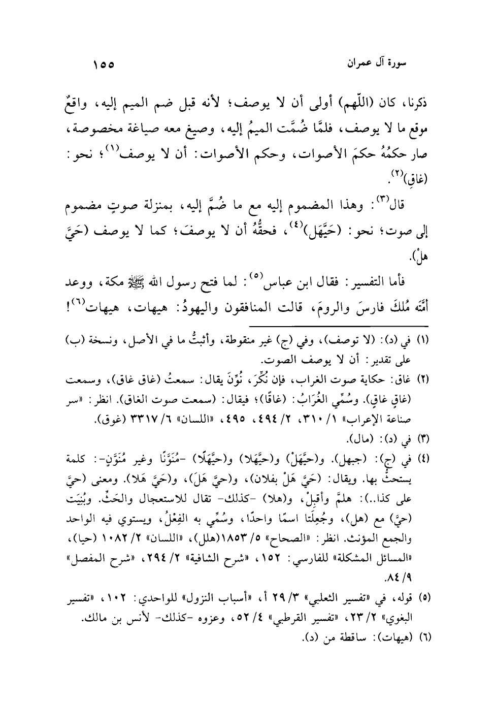 ذكرنا، كان (اللهم) أولى أن لا يوصف؛ لأنه قبل ضم الميم إليه، واقعٌ موقع ما لا يوصف، فلمَّا ضُمَّت الميمُ إليه، وصيغ معه صياغة مخصوصة، صار حكمُهُ حكمَ الأصوات، وحكم الأصوات: أن لا يوصف (¬1)؛ نحو: (غاقِ) (¬2).
