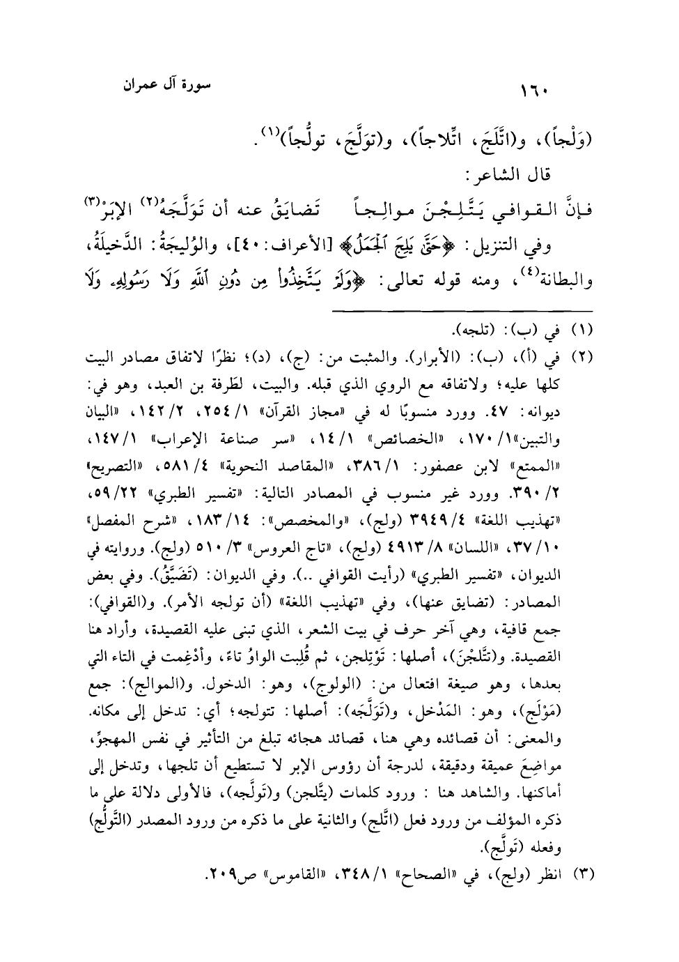 (¬3) في (أ)، (ب): (الأبرار). والمثبت من: (ج)، (د)؛ نظرًا لاتفاق مصادر البيت كلها عليه؛ ولاتفاقه مع الروي الذي قبله. والبيت، لطَرفة بن العبد، وهو في: ديوانه: 47. وورد منسوبًا له في "مجاز القرآن" 1/ 254، 2/ 142، "البيان والتبين" 1/ 170، "الخصائص" 1/ 14، "سر صناعة الإعراب" 1/ 147، "الممتع" لابن عصفور: 1/ 386، "المقاصد النحوية" 4/ 581، "التصريح" 2/ 390. وورد غير منسوب في المصادر التالية: "تفسير الطبري" 22/ 59، "تهذيب اللغة" 4/ 3949 (ولج)، "والمخصص":14/ 183، "شرح المفصل" 10/ 37، "اللسان" 8/ 4913 (ولج)، "تاج العروس" 3/ 510 (ولج). وروايته في الديوان، "تفسير الطبري" (رأيت القوافي ..). وفي الديوان: (تَضَيَّقُ). وفي بعض المصادر: (تضايق عنها)، وفي "تهذيب اللغة" (أن تولجه الأمر). و (القوافي): جمع قافية، وهي آخر حرف في بيت الشعر، الذي تبنى عليه القصيدة، وأراد هنا القصيدة. و (تتَّلجْنَ)، أصلها: تَوْتِلجن، ثم قُلِبت الواوُ تاءً، وأدْغِمت في التاء التي بعدها، وهو صيغة افتعال من: (الولوج)، وهو: الدخول. و (الموالج): جمع (مَوْلَج)، وهو: المَدْخل، و (تَوَلَّجَه): أصلها: تتولجه؛ أي: تدخل إلى مكانه. والمعنى: أن قصائده وهي هنا، قصائد هجائه تبلغ من التأثير في نفس المهجوِّ، مواضِعَ عميقة ودقيقة، لدرجة أن رؤوس الإبر لا تستطيع أن تلجها، وتدخل إلى أماكنها. والشاهد هنا: ورود كلمات (يتلجن) و (تَولَّجه)، فالأولى دلالة على ما ذكره المؤلف من ورود فعل (اتَّلج) والثانية على ما ذكره من ورود المصدر (التَّولُّج) وفعله (تَولَّج).
