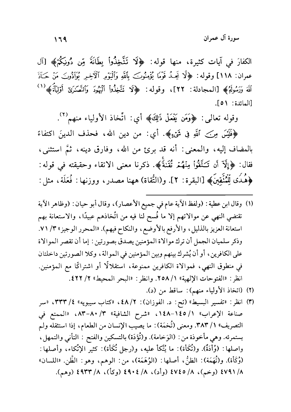 {فَلَيْسَ مِنَ اللَّهِ فِي شَيْءٍ}. أي: من دين الله، فحذف الدينَ اكتفاءً بالمضاف إليه، والمعنى: أنه قد برئ من الله، وفارق دينه، ثمَّ استثنى، فقال: {إِلَّا أَنْ تَتَّقُوا مِنْهُمْ تُقَاةً}. ذكرنا معنى الاتقاء وحقيقته في قوله: {هُدًى لِلْمُتَّقِينَ} [البقرة: 2]. و (التُّقاة) ههنا مصدر، ووزنها: فُعَلَة، مثل: