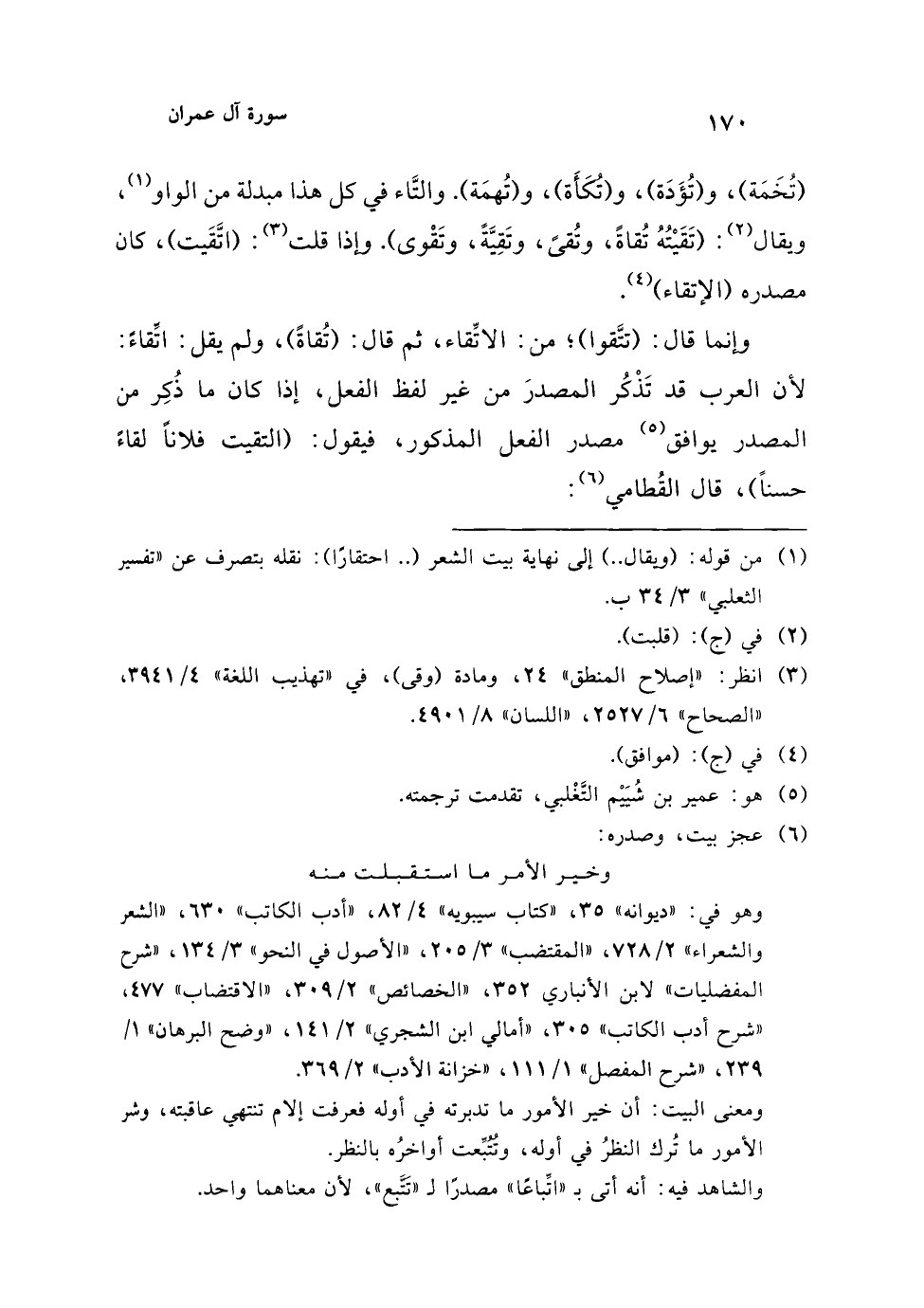 وإنما قال: (تتَّقوا)؛ من: الاتِّقاء، ثم قال: (تُقاةً)، ولم يقل: اتِّقاءً: لأن العرب قد تَذْكُر المصدرَ من غير لفظ الفعل، إذا كان ما ذُكِر من المصدر يوافق (¬5) مصدر الفعل المذكور، فيقول: (التقيت فلاناً لقاءً حسناً)، قال القُطامي (¬6):