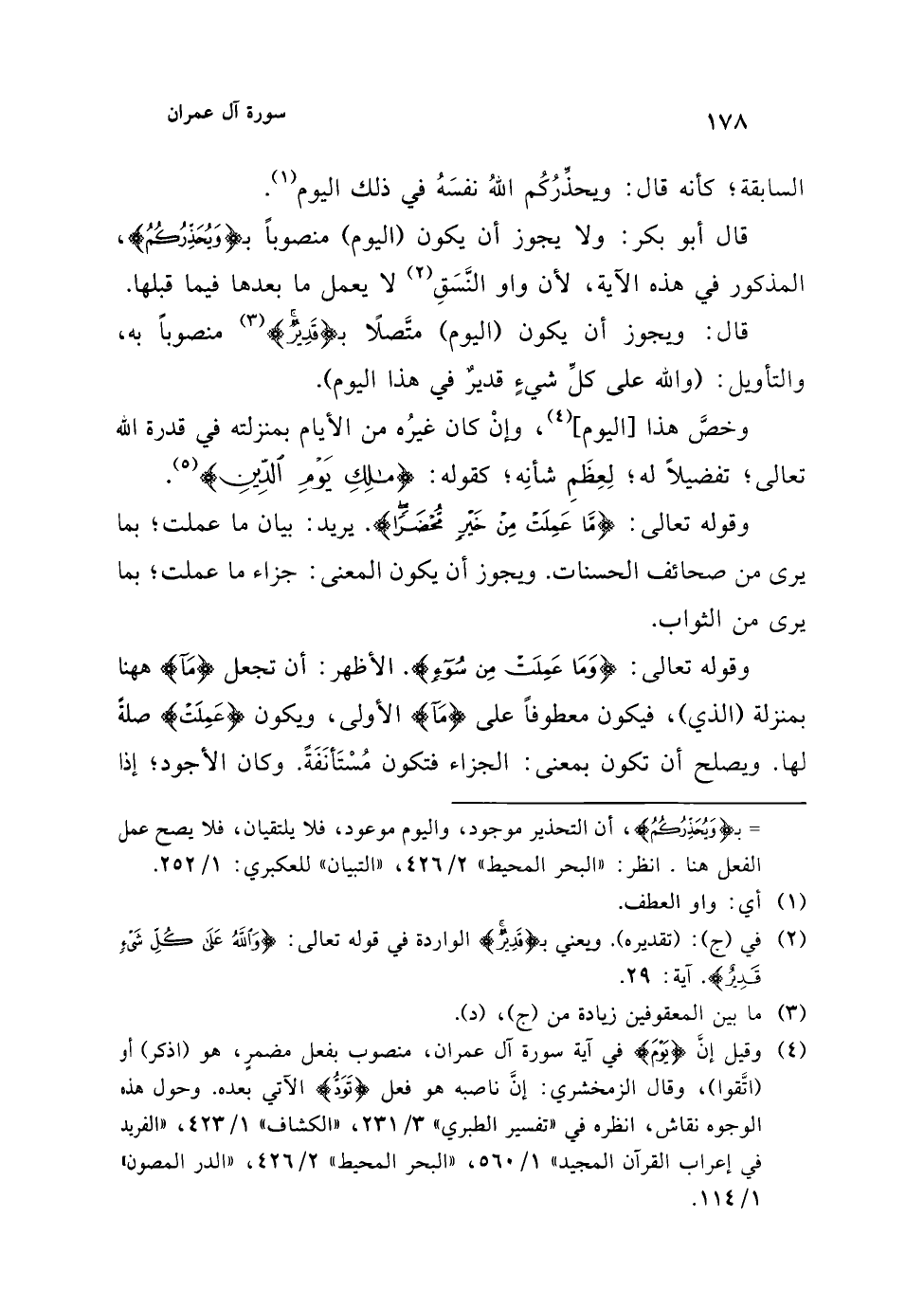 (¬5) وقيل إنَّ {يَوْمَ} في آية سورة آل عمران، منصوب بفعل مضمرٍ، هو (اذكر) أو (اتَّقوا)، وقال الزمخشري: إنَّ ناصبه هو فعل {تَوَدُّ} الآتي بعده. وحول هذه الوجوه نقاش، انظره في "تفسير الطبري" 3/ 231، "الكشاف" 1/ 423، "الفريد في إعراب القرآن المجيد" 1/ 560، "البحر المحيط" 2/ 426، "الدر المصون" 1/ 114.