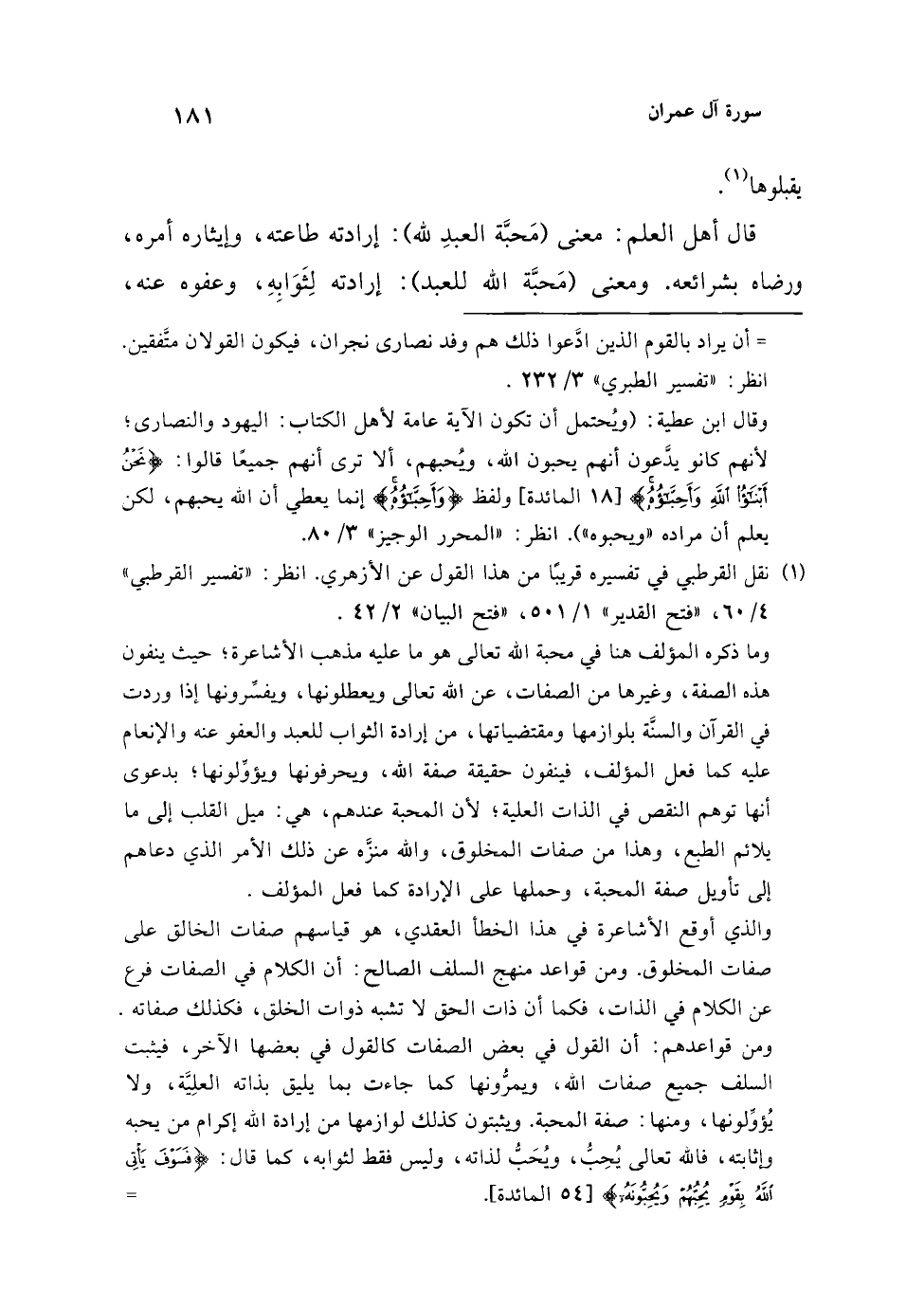 ورجَّح الطبري هذا القول، قائلًا: (لأنه لم يجر لغير وفد نجران في هذه السورة، ولا قبل هذه الآية ذكْرُ قوم ادَّعوا أنهم يحبُّون الله، ولا أنهم يُعَظِّمُونه)، ولم يجزم الطبري بصحة قول الحسن السابق، وبيَّن أنه ليس في السورة ما يدل عليه، إلا أن يراد بالقوم الذين ادَّعوا ذلك هم وفد نصارى نجران، فيكون القولان متَّفقين. انظر: "تفسير الطبري" 3/ 232.