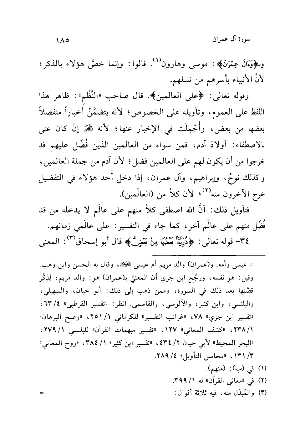 (¬1) وهو قول ابن عباس ومقاتل، وممن ذهب إليه الكرماني وابن جماعة وقيل: عيسى وأمه. و (عمران) والد مريم أم عيسى عليه السلام، وقال به الحسن وابن وهب. وقيل: هو نفسه، ورجَّح ابن جزي أن المعنيَّ بـ (عمران) هو: والد مريم؛ لِذِكْر قصَّتِها بعد ذلك في السورة، وممن ذهب إلى ذلك: أبو حيان، والسهيلي، والبلنسي، وابن كثير، والآلوسي، والقاسمي. انظر: "تفسير القرطبي" 4/ 63، "تفسير ابن جزي" 78، "غرائب التفسير" للكرماني 1/ 251، "وضح البرهان" 1/ 238، "كشف المعاني" 127، "تفسير مبهمات القرآن" للبلنسي 1/ 279، "البحر المحيط" لأبي حيان 2/ 434، "تفسير ابن كثير" 1/ 384، "روح المعاني" 3/ 131، "محاسن التأويل" 4/ 289.