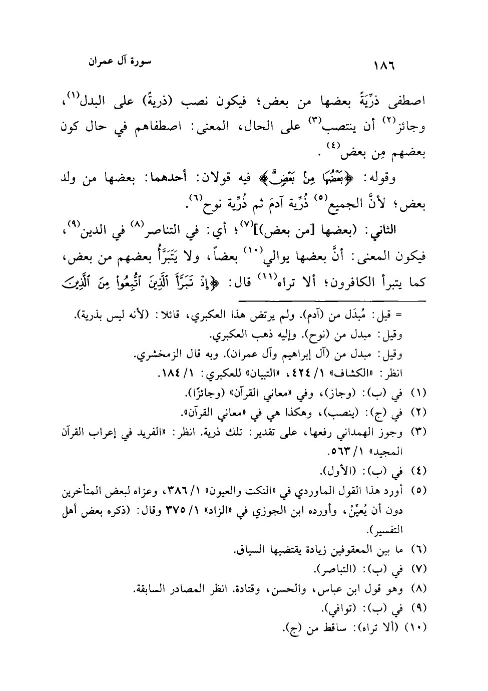 (¬1) والمُبدَل منه، فيه ثلاثة أقوال: قيل: مُبدَل من (آدم). ولم يرتض هذا العكبري، قائلا: (لأنه ليس بذرية). وقيل: مبدل من (نوح). وإليه ذهب العكبري. وقيل: مبدل من (آل إبراهيم وآل عمران). وبه قال الزمخشري. انظر: "الكشاف" 1/ 424، "التبيان" للعكبري: 1/ 184.