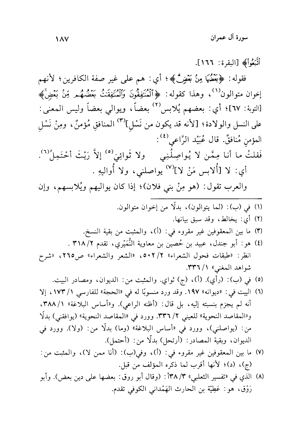 فقوله: {بَعْضُهَا مِنْ بَعْضٍ}، أي: هم على غير صفة الكافرين؛ لأنهم إخوان متوالون (¬1)، وهذا كقوله: {الْمُنَافِقُونَ وَالْمُنَافِقَاتُ بَعْضُهُمْ مِنْ بَعْضٍ} [التوبة: 67]؛ أي: بعضهم يُلابس (¬2) بعضاً، ويوالي بعضاً وليس المعنى: على النسل والولادة، [لأنه قد يكون من نَسْلِ] (¬3) المنافقِ مُؤمنٌ، ومِنْ نَسْلِ المؤمنِ مُنافقٌ. قال عُبَيْد الرَّاعي (¬4):