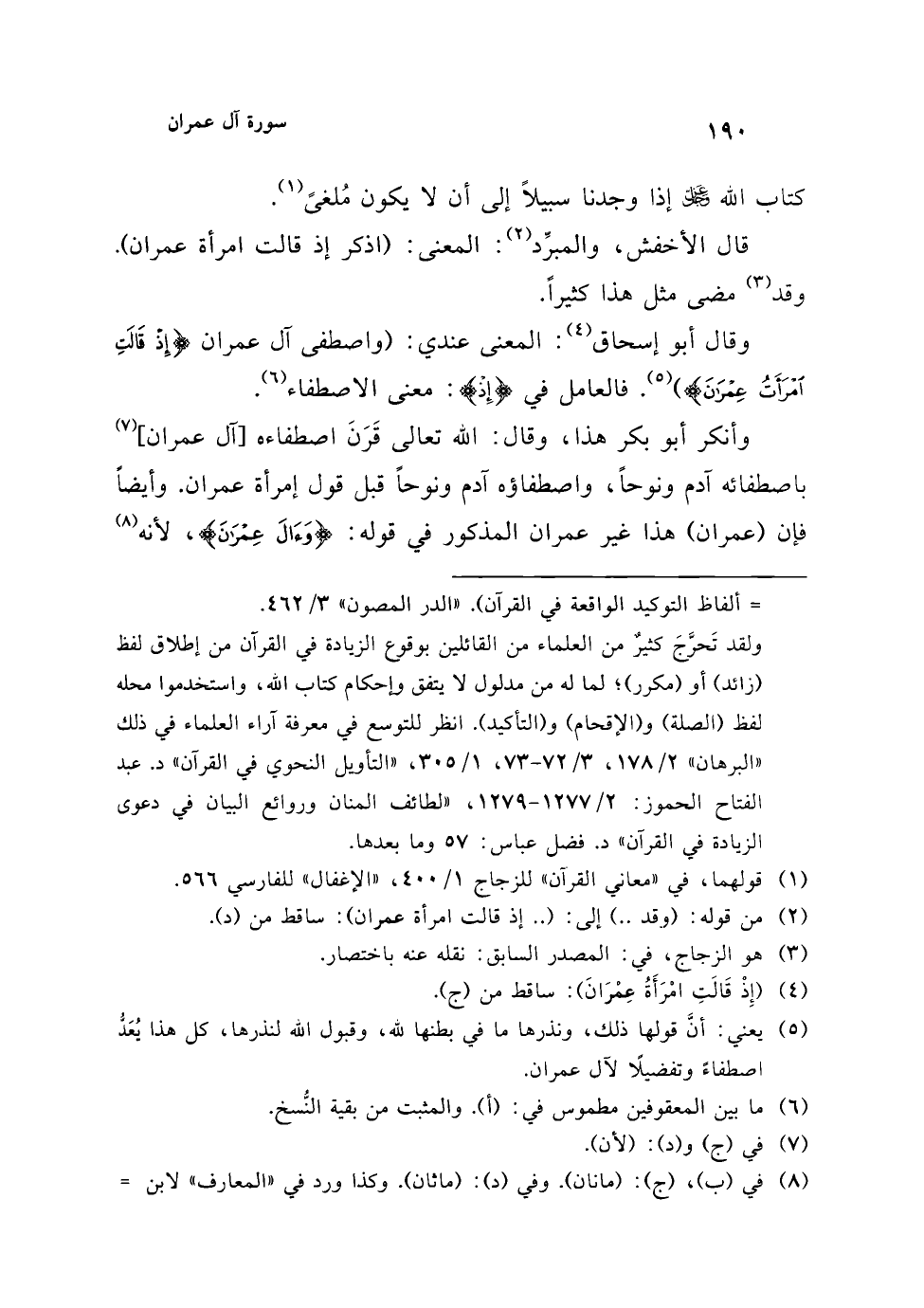 (¬1) اختلف أهل النحو والتفسير في وقوع الزوائد في القرآن؛ بين مانع لذلك، وبين مُجوِّز. فمن (8) المانعين: المبرد، وثعلب، وداود الظاهري، وابن السَّرّاج، الذي رفض أن يكون في لغة العرب زوائد. وهناك من جوز ذلك، فرأى أن وجود هذه الزوائد كعدمها، وقال الزركشي عن هذا الرأي: (وهذا أفسد الطرق) "البرهان" 3/ 73. وأكثر النحويين على أن في القرآن حروفًا زوائد، ولكن من جهة الإعراب، لا من جهة المعنى؛ حيث إن لهذه الزوائد فوائد كثيرة منها: فصاحة اللفظ وحسنه، وتوكيد المعنى، وتمييز مدلوله عن غيره، إلى غير ذلك. وهذا ما تميل إليه النفس. قال السمين الحلبي عن القائلين بزيادة بعض الحروف: (لا يعنون أنه يجوز سقوطه، ولا أنه مُهْمَل لا معنى له. بل يقولون: زائد للتوكيد. فله أسوة بسائر ألفاظ التوكيد الواقعة في القرآن). "الدر المصون" 3/ 462.