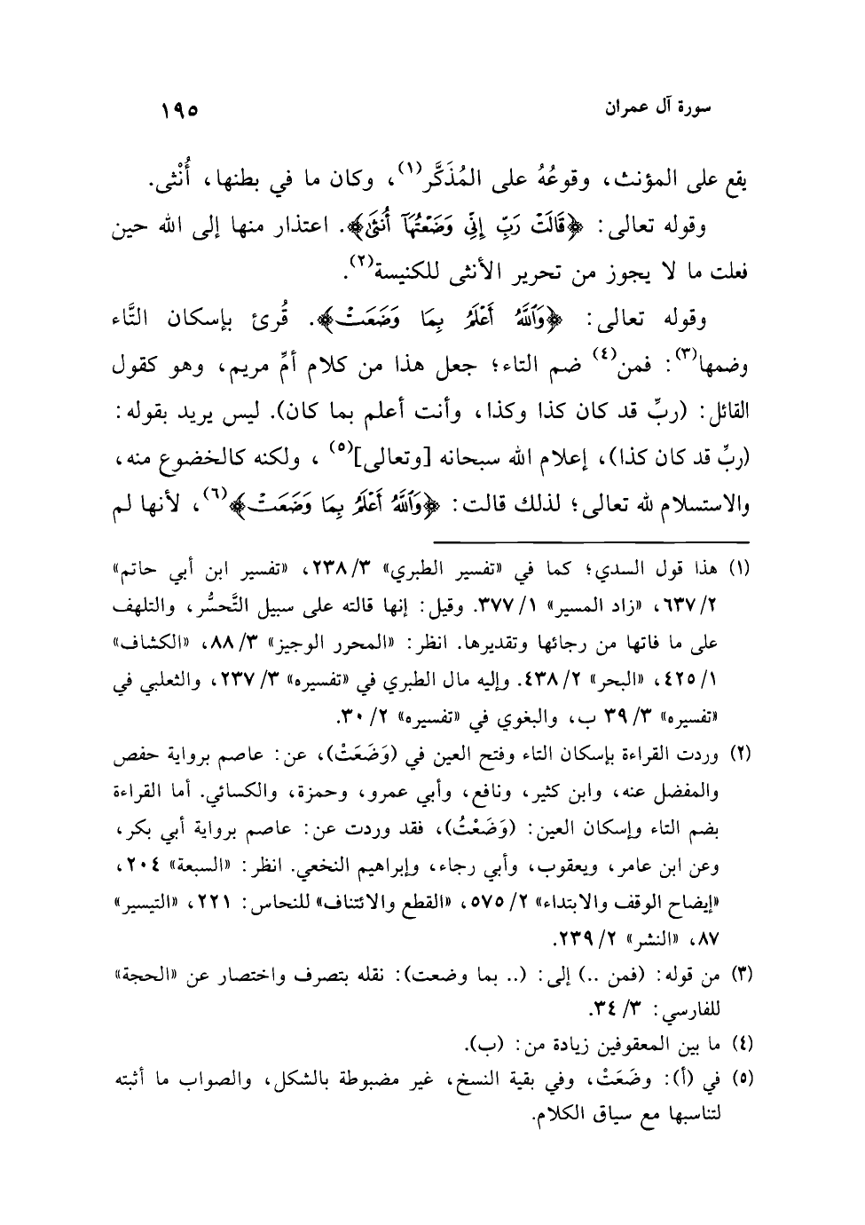 وقوله تعالى: {وَاللَّهُ أَعْلَمُ بِمَا وَضَعَتْ}. قُرئ بإسكان التَّاء وضمها (¬3):فمن (¬4) ضم التاء؛ جعل هذا من كلام أمِّ مريم، وهو كقول القائل: (ربِّ قد كان كذا وكذا، وأنت أعلم بما كان). ليس يريد بقوله: (ربِّ قد كان كذا)، إعلام الله سبحانه [وتعالى] (¬5)، ولكنه كالخضوع منه، والاستسلام لله تعالى، لذلك قالت: {وَاللَّهُ أَعْلَمُ بِمَا وَضَعَتْ} (¬6)، لأنها لم