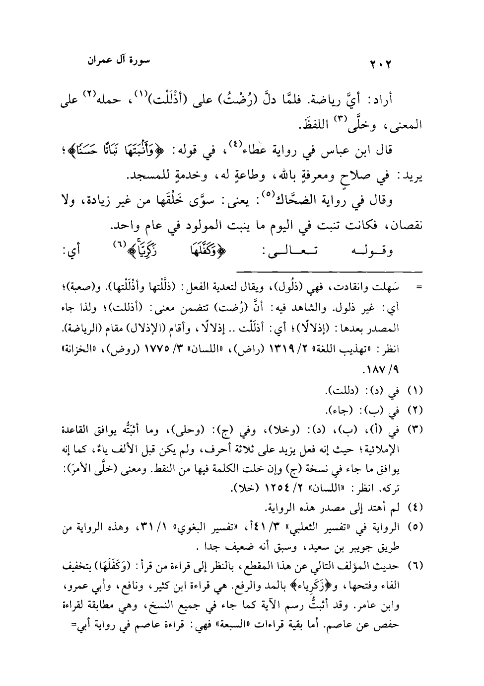 (¬6) حديث المؤلف التالي عن هذا المقطع، بالنظر إلى قراءة من قرأ: (وَكَفَلَهَا) بتخفيف الفاء وفتحها، و {زَكَرِيَّا} بالمد والرفع. هي قراءة ابن كثير، ونافع، وأبي عمرو، وابن عامر. وقد أثبتُّ رسم الآية كما جاء في جميع النسخ، وهي مطابقة لقراءة حفص عن عاصم. أما بقية قراءات "السبعة" فهي: قراءة عاصم في رواية أبي=