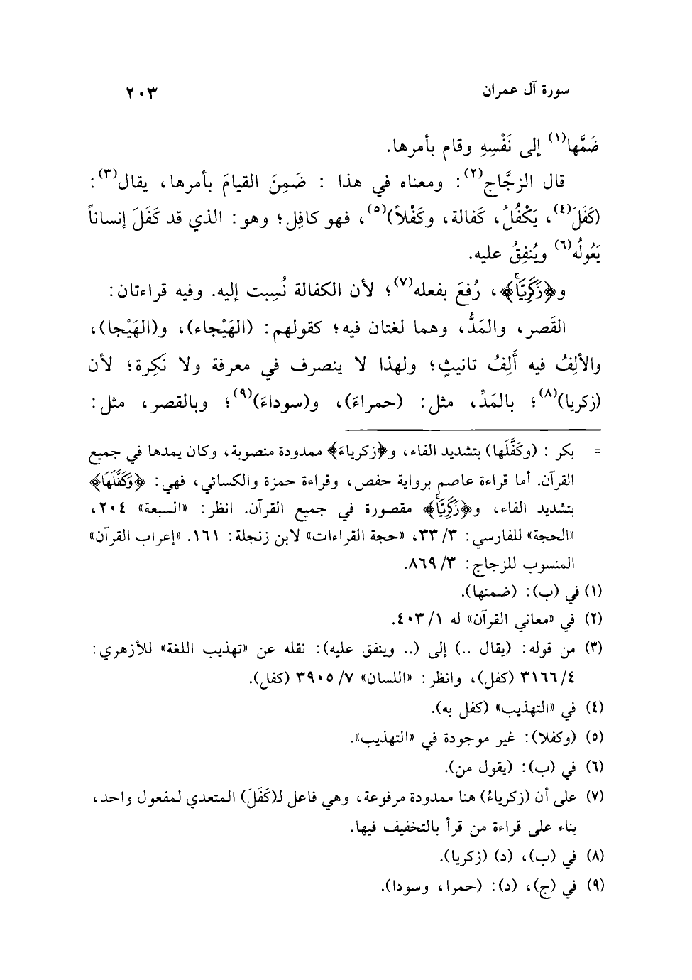 (¬7) على أن (زكرياءُ) هنا ممدودة مرفوعة، وهي فاعل لـ (كَفَلَ) المتعدي لمفعول واحد، بناء على قراءة من قرأ بالتخفيف فيها.
