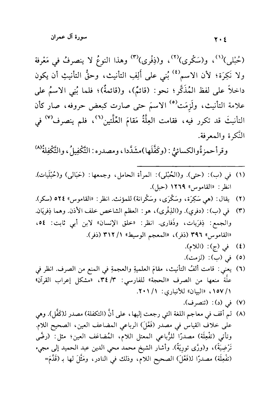 (¬6) يعني: قامت ألفُ التأنيث، مقامَ العلميةِ والعجمةِ في المنع من الصرف. انظر في علَّة منعها من الصرف "الحجة" للفارسي: 3/ 34، "مشكل إعراب القرآن" 1/ 157، "البيان" للأنباري: 1/ 201.