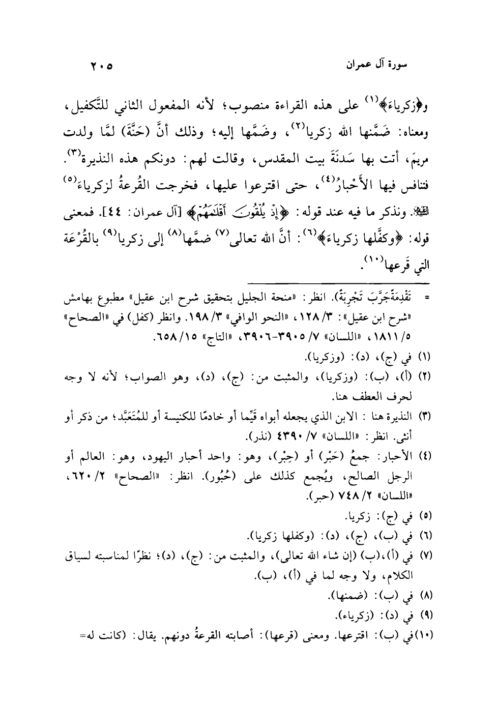 و {زَكَرِيَّا} (¬1) على هذه القراءة منصوب؛ لأنه المفعول الثاني للتَّكفيل، ومعناه: ضَمَّنها الله زكريا (¬2)، وضَمَّها إليه؛ وذلك أنَّ (حَنَّةَ) لمَّا ولدت مريمَ، أتت بها سَدنَةَ بيت المقدس، وقالت لهم: دونكم هذه النذيرة (¬3). فتنافس فيها الأَحْبارُ (¬4)، حتى اقترعوا عليها، فخرجت القُرعة لزكرياءَ (¬5) عليه السلام. ونذكر ما فيه عند قوله: {إِذْ يُلْقُونَ أَقْلَامَهُمْ} [آل عمران: 44]. فمعنى قوله: {وَكَفَّلَهَا زَكَرِيَّا} (¬6): أنَّ الله تعالى (¬7) ضمَّها (¬8) إلى زكريا (¬9) بالقُرْعَة التي قَرعها (¬10).