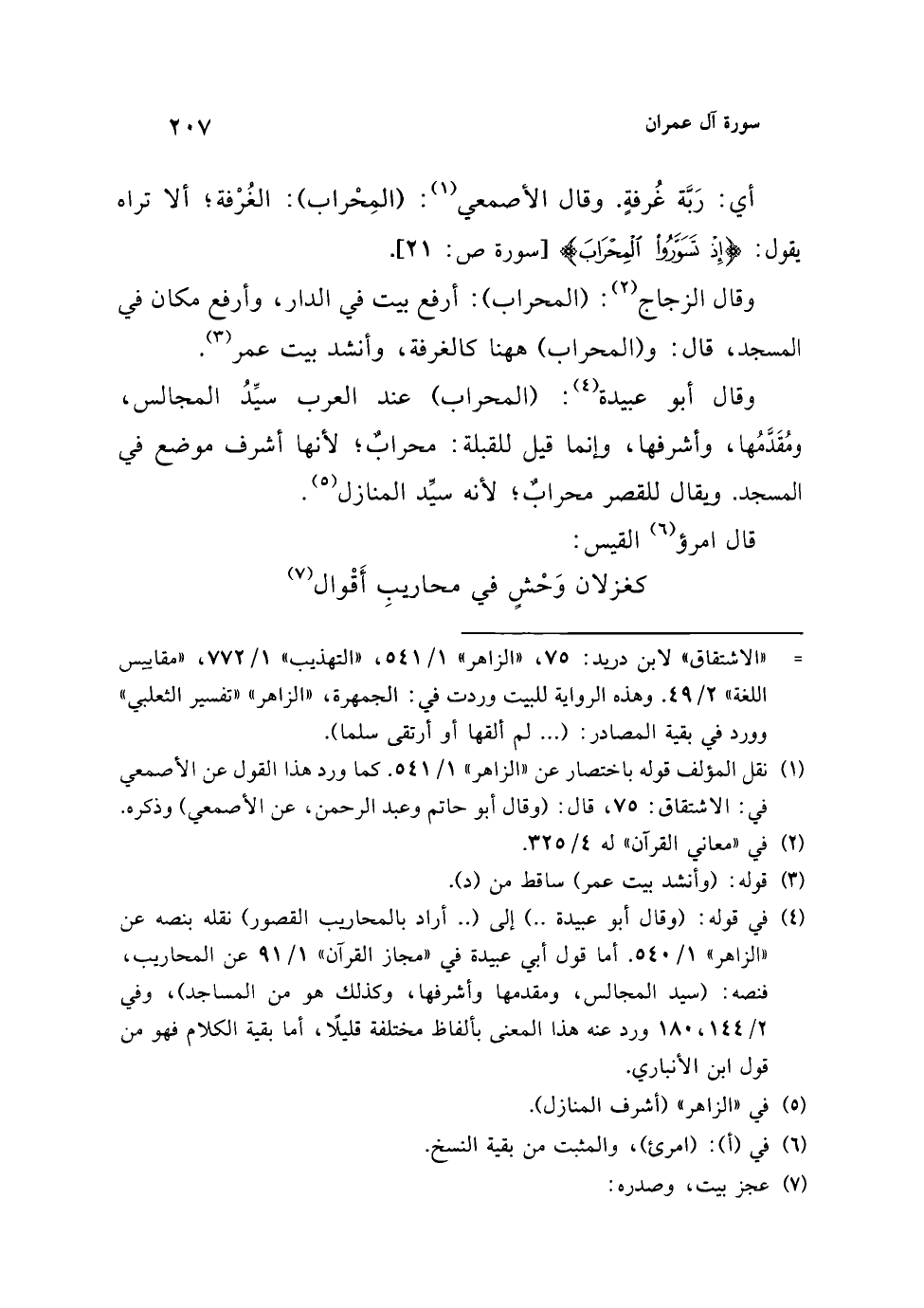 (¬4) في قوله: (وقال أبو عبيدة ..) إلى (.. أراد بالمحاريب القصور) نقله بنصه عن "الزاهر" 1/ 540. أما قول أبي عبيدة في "مجاز القرآن" 1/ 91 عن المحاريب، فنصه: (سيد المجالس، ومقدمها وأشرفها، وكذلك هو من المساجد)، وفي 2/ 144، 180 ورد عنه هذا المعنى بألفاظ مختلفة قليلًا، أما بقية الكلام فهو من قول ابن الأنباري.