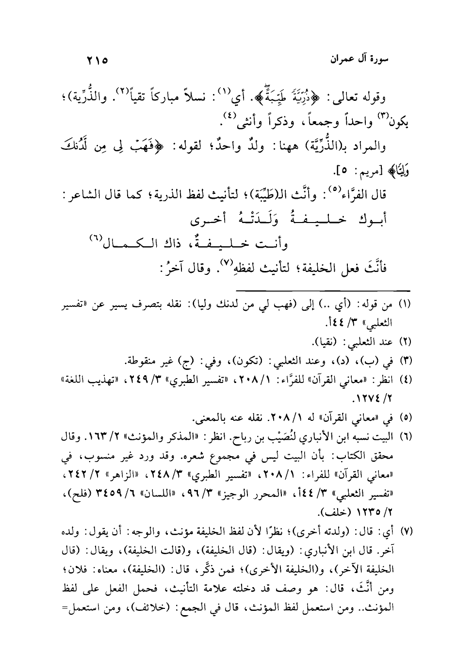 (¬1) من قوله: (أي ..) إلى (فهب لي من لدنك وليا): نقله بتصرف يسير عن "تفسير الثعلبي" 3/ 44 أ.