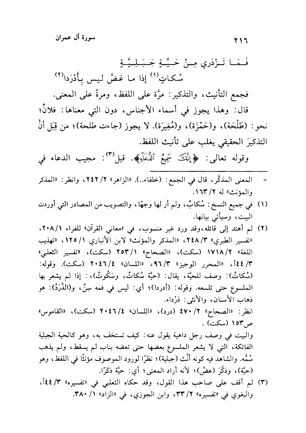 (¬2) لم أهتد إلى قائله، وقد ورد غير منسوب، في "معاني القرآن" للفراء 1/ 208، "تفسير الطبري" 3/ 248، "المذكر والمؤنث" لابن الأنباري 1/ 125، "تهذيب اللغة" 2/ 1718 (سكت)، "الصحاح" 1/ 253 (سكت)، "تفسير الثعلبي" 3/ 44 أ، "المحرر الوجيز" 3/ 96، "اللسان" 4/ 2046 (سكت). وقوله: (سُكاتٌ): وصف للحيَّة، يقال: (حيَّة سُكاتٌ، وسَكُوتٌ)،: إذا لم يشعر بها الملسوع حتى تلسعه وقوله: (أدردا)؛ أي: ليس في فمه سِنٌ، و (الدَّرَدُ): هو ذهاب الأسنان، والأنثى: دَرْداء.