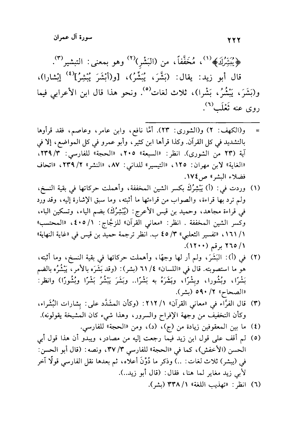 (¬5) لم أقف على قول ابن زيد فيما رجعت إليه من مصادر، ويبدو أن هذا قول أبي الحسن (الأخفش)، كما في "الحجة" للفارسي 3/ 37، ونصه: (قال أبو الحسن: في (يبشر) ثلاث لغات: ..) وذكر ما دُوِّنَ أعلاه، ثم بعدها نقل الفارسي قولًا آخر لأبي زيد مغاير لما هنا، فقال: (قال أبو زيد ..).