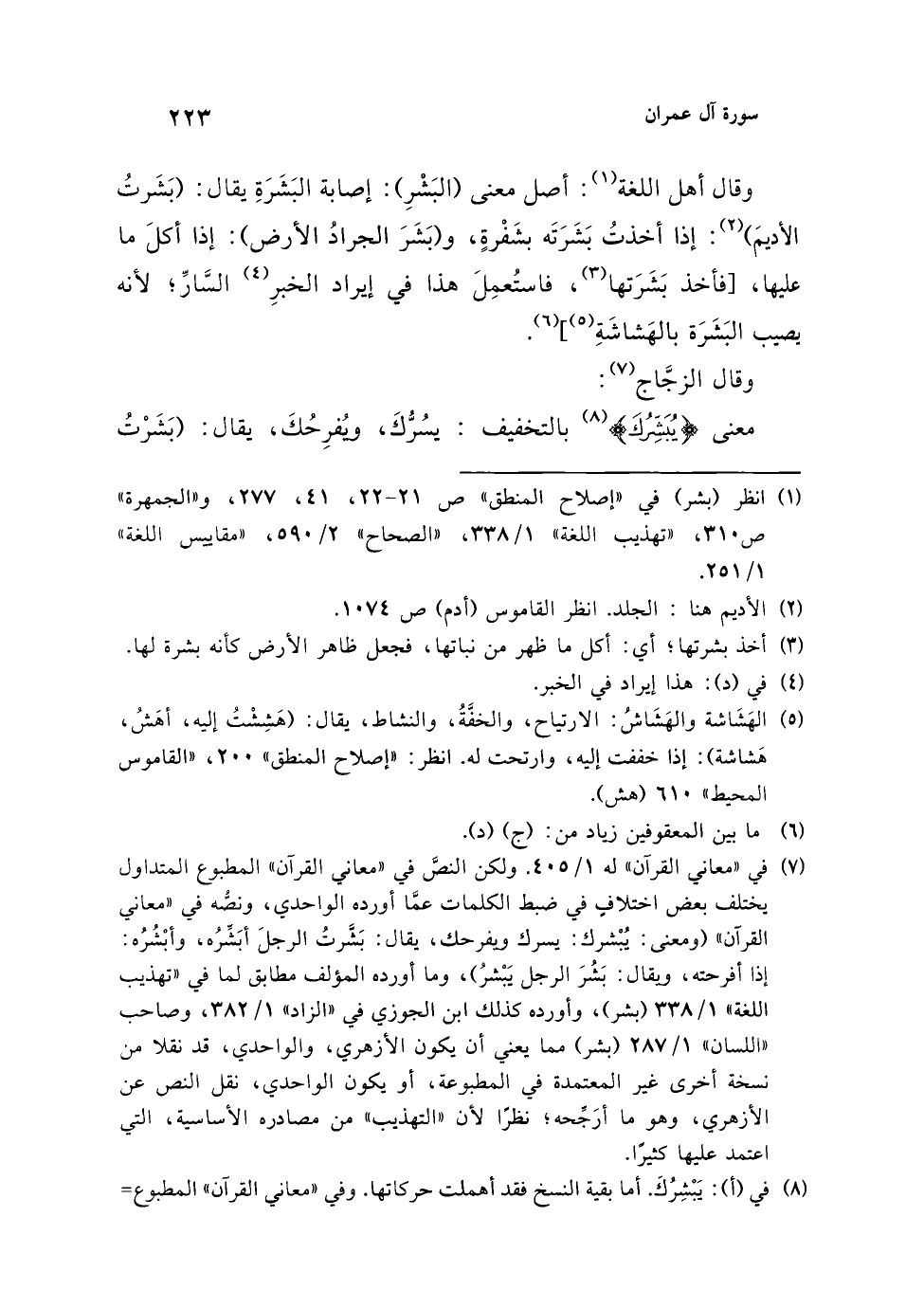 (¬7) في "معاني القرآن" له 1/ 405. ولكن النصَّ في "معاني القرآن" المطبوع المتداول يختلف بعض اختلافٍ في ضبط الكلمات عمَّا أورده الواحدي، ونصه في "معاني القرآن" (ومعنى: يُبْشرك: يسرك ويفرحك، يقال: بَشَّرتُ الرجلَ أبَشِّرُه، وأبْشُرُه: إذا أفرحته، ويقال: بَشُرَ الرجل يَبْشرُ)، وما أورده المؤلف مطابق لما فى "تهذيب اللغة" 1/ 338 (بشر)، وأورده كذلك ابن الجوزي في "الزاد" 1/ 382، وصاحب "اللسان" 1/ 287 (بشر) مما يعني أن يكون الأزهري، والواحدي، قد نقلا من نسخة أخرى غير المعتمدة في المطبوعة، أو يكون الواحدي، نقل النص عن الأزهري، وهو ما أرجحه؛ نظرًا لأن "التهذيب" من مصادره الأساسية، التي اعتمد عليها كثيرًا.