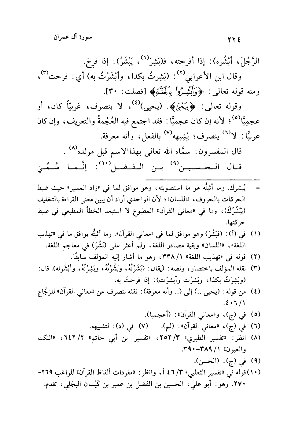 (¬4) من قوله: (يحيى ..) إلى (.. وأنه معرفة): نقله بتصرف عن "معاني القرآن" للزجَّاج 1/ 406.