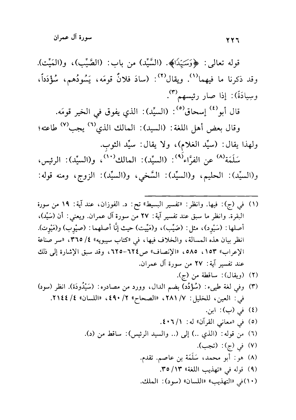 سَلَمَة (¬8) عن الفرَّاء (¬9): (السيِّد): المالك (¬10)، و (السيِّد): الرئيس، و (السيِّد): الحليم، و (السيِّد): السَّخي، و (السيِّد): الزوج، ومنه قوله: