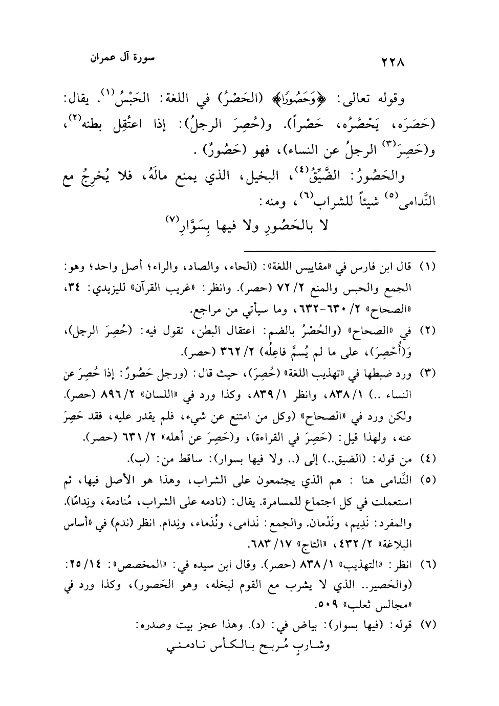 (¬6) انظر: "التهذيب" 1/ 838 (حصر). وقال ابن سيده في: "المخصص": 14/ 25: (والحَصير .. الذي لا يشرب مع القوم لبخله، وهو الحَصور)، وكذا ورد في "مجالس ثعلب" 509.