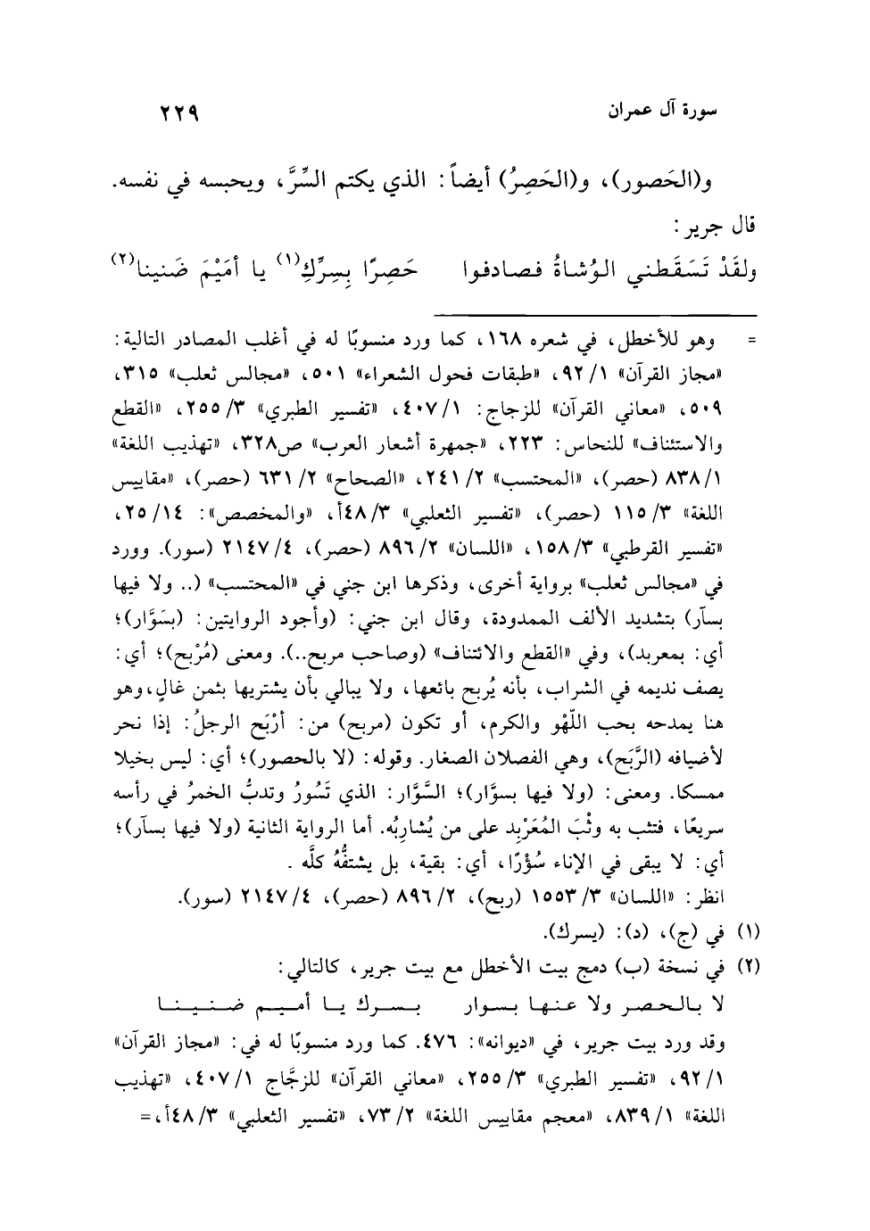= وهو للأخطل، في شعره 168، كما ورد منسوبًا له في أغلب المصادر التالية: "مجاز القرآن" 1/ 92، "طبقات فحول الشعراء" 501، "مجالس ثعلب" 315، 509، "معاني القرآن" للزجاج: 1/ 407، "تفسير الطبري" 3/ 255، "القطع والاستئناف" للنحاس: 223، "جمهرة أشعار العرب" ص 328، "تهذيب اللغة" 1/ 838 (حصر)، "المحتسب" 2/ 241، "الصحاح" 2/ 631 (حصر)، "مقاييس اللغة" 3/ 115 (حصر)، "تفسير الثعلبي" 3/ 48 أ، "والمخصص": 14/ 25، "تفسير القرطبي" 3/ 158، "اللسان" 2/ 896 (حصر)، 4/ 2147 (سور). وورد في "مجالس ثعلب" برواية أخرى، وذكرها ابن جني في "المحتسب" (.. ولا فيها بسآر) بتشديد الألف الممدودة، وقال ابن جني: (وأجود الروايتين: (بسَوَّار)؛ أي: بمعربد)، وفي "القطع والائتناف" (وصاحب مربح ..). ومعنى (مُرْبح)؛ أي: يصف نديمه في الشراب، بأنه يُربح بائعها، ولا يبالي بأن يشتريها بثمن غالٍ، وهو هنا يمدحه بحب اللهْو والكرم، أو تكون (مربح) من: أرْبَح الرجلُ: إذا نحر لأضيافه (الرَّبَح)، وهي الفصلان الصغار. وقوله: (لا بالحصور)؛ أي: ليس بخيلا ممسكا. ومعنى: (ولا فيها بسوَّار)؛ السَّوَّار: الذي تَسُورُ وتدبُّ الخمرُ في رأسه سريعًا، فتثب به وثْبَ المُعَرْبِد على من يُشارِبُه. أما الرواية الثانية (ولا فيها بسآر)؛ أي: لا يبقى في الإناء سُؤْرًا، أي: بقية، بل يشتفُّهُ كلَّه. انظر: "اللسان" 3/ 1553 (ربح)، 2/ 896 (حصر)، 4/ 2147 (سور).