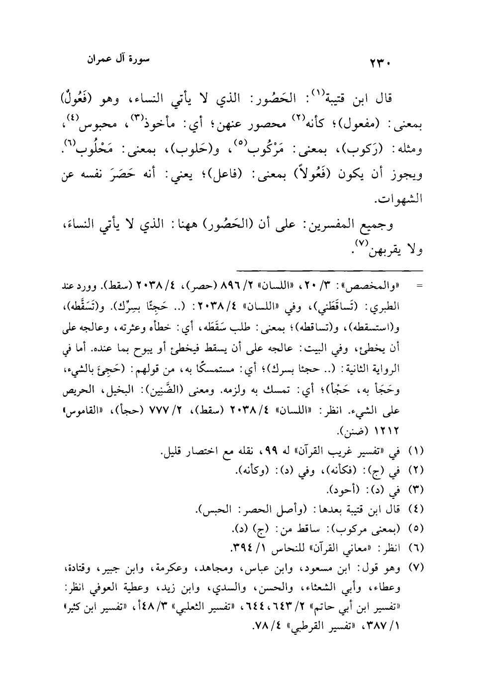 قال ابن قتيبة (¬1): الحَصُور: الذي لا يأتي النساء، وهو (فَعُولٌ) بمعنى: (مفعول)؛ كأنه (¬2) محصور عنهن، أي: مأخوذ (¬3)، محبوس (¬4)، ومثله: (رَكوب)، بمعنى: مَرْكُوب (¬5)، و (حَلوب)، بمعنى: مَحْلُوب (¬6). ويجوز أن يكون (فَعُولاً) بمعنى: (فاعل)؛ يعني: أنه حَصَرَ نفسه عن الشهوات.