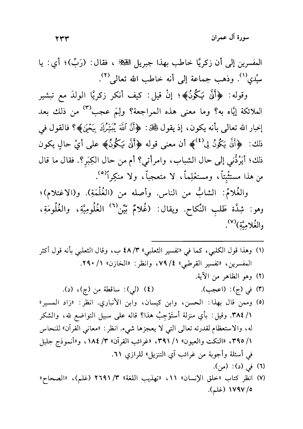 وقوله: {أَنَّى يَكُونُ} إنْ قيل: كيف أنكر زكريَّا الولدَ مع تبشير الملائكة إيَّاه به؟ وما معنى هذه المراجعة؟ ولِمَ عجب (¬3) من ذلك بعد إخبار الله تعالى بأنه يكون، إذ يقول عز وجل: {أَنَّ اللَّهَ يُبَشِّرُكَ بِيَحْيَى}؟ فالقول في ذلك: {أَنَّى يَكُونُ لِي} (¬4) أن معنى قوله {أَنَّى يَكُونُ} على أيِّ حالٍ يكون ذلك؛ أيَرُدُّني إلى حال الشباب، وامرأتي؟ أم من حال الكِبَرِ؟. فقال ما قال من هذا مستثْبِتاً، ومستعْلِماً، لا متعجباً، ولا منكِراً (¬5).