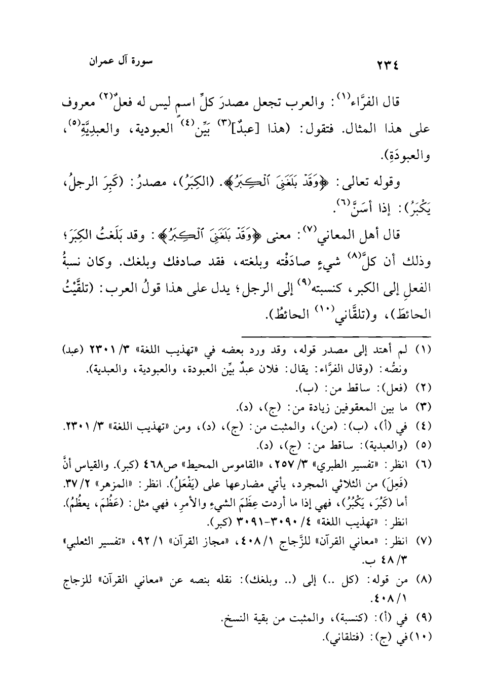(¬6) انظر: "تفسير الطبري" 3/ 257، "القاموس المحيط" ص 468 (كبر). والقياس أنَّ (فَعِلَ) من الثلاثي المجرد، يأتي مضارعها على (يَفْعَلُ). انظر: "المزهر" 2/ 37. أما (كَبُرَ، يَكْبُرُ)، فهي إذا ما أردت عِظَمَ الشيءِ والأمرِ، فهي مثل: (عَظُمَ، يعظُمُ). انظر: "تهذيب اللغة" 4/ 3090 - 3091 (كبر).